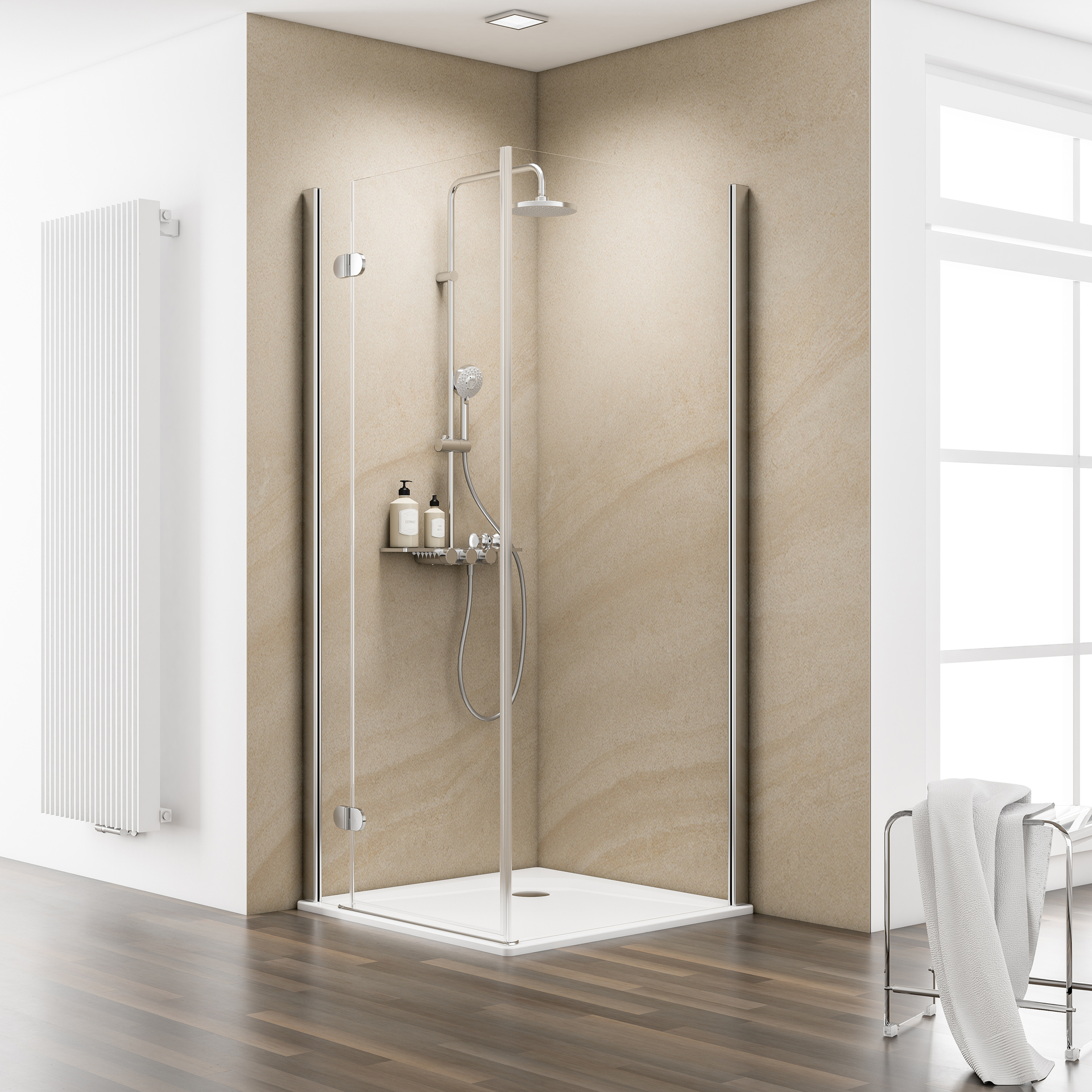 Duschkabinen Set (Drehtür an Nebenteil mit Seitenwand) und Duschwanne extra-flach, inkl. Stellfüße und Markenablauf