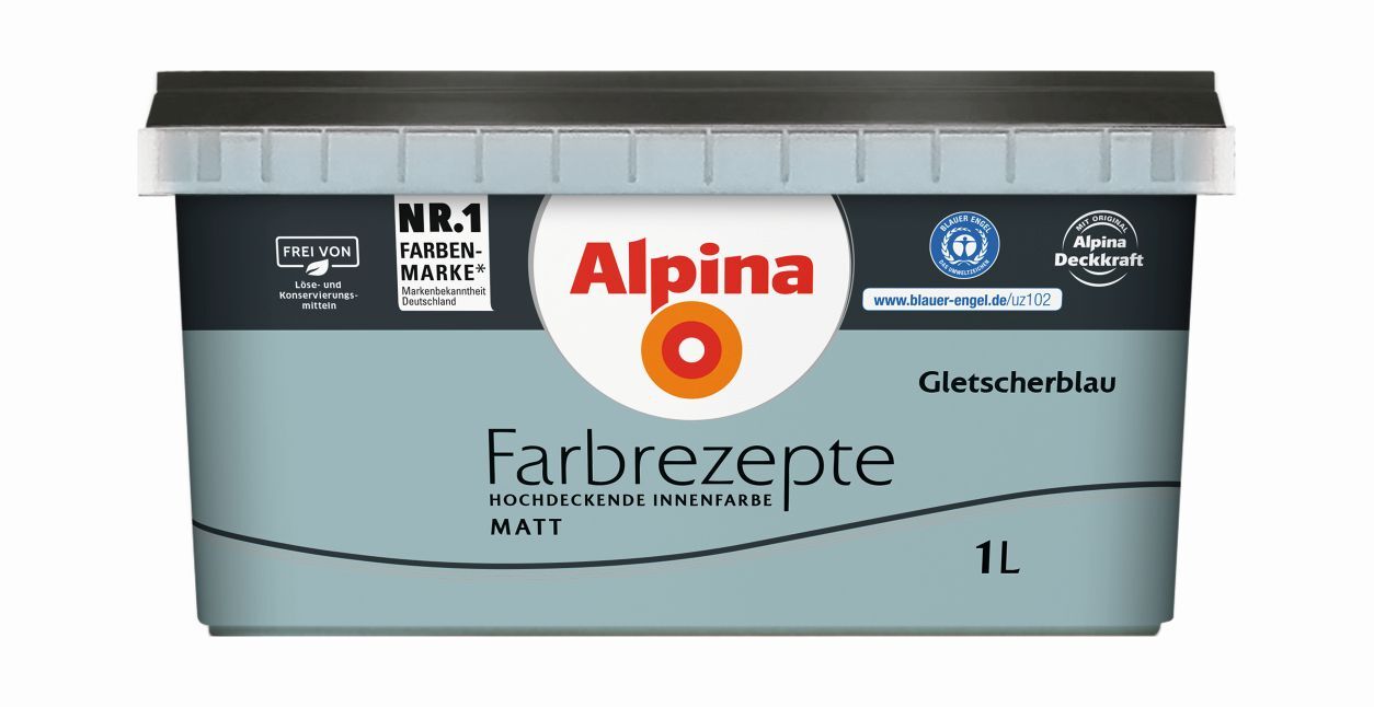 Alpina Farbrezepte „Gletscherblau“ ist ein frisches, nordisch anmutendes Graublau, das seine Wirkung von Ferne und Klarheit allein entfalten kann, aber auch in Kombination mit harmonischen Farbklängen aus der Natur wie Kiesel- und Sandtönen sowie Weiß.