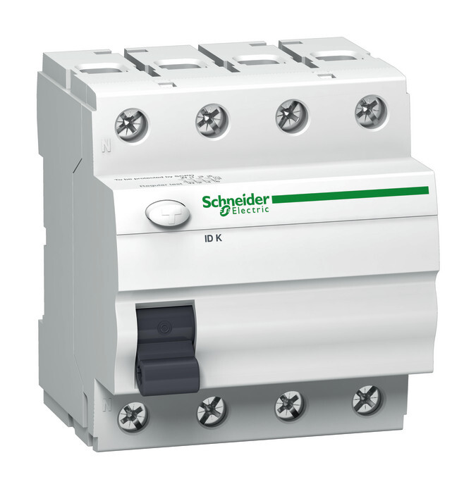 Fehlerstrom-Schutzschalter Serie IDK. 3 polig + N, 40A, Nennfehlerstrom 30mA, Typ A. Bedingter Bemessungskurzschlussstrom (Inc/I?c) 10.000A, gemäß EN 61008. Betriebsspannung (Ue) 400V AC, Betriebsfrequenz 50 Hz, Neutralposition links. Doppelfunktionsklemme für Kabel und Gabelkammschiene an der Geräteunterseite. Hintenliegendes Hutschienen-Befestigungselement an der Geräteunterseite. Sprungschaltung für verschleißarmes und vom Anwender unabhängiges Schalten der Kontakte.