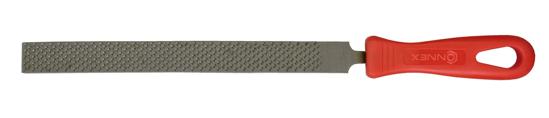 Die Feilenraspel von CONNEX hat einen Kunststoffgriff und ist 200 mm lang. Sie ist aus Stahl gefertigt und hat eine Härte von 50-55 HRC. Der Hieb ist auf der Vorderseite halbschlicht (Hieb Nr.2) und auf der Rückseite bastard (Hieb Nr.1)