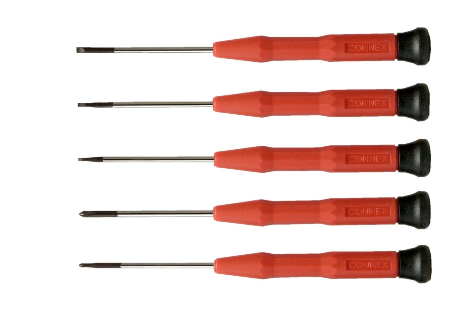 Der Feinmechaniker-Schraubendreher-Satz von CONNEX ist 5 teilig. Die Klingen sind aus Chrom-Vanadium-Stahl gefertigt und haben passgenaue Spitzen. Griff mit drehbarer und ergonomisch geformter Muldenkappe für den idealen Drehpunkt. Der Satz besteht aus: 3 Schlitzschraubendreher, Größen: 1,5 – 2,0 – 2,5 x 60mm 2 Kreuzschlitzschraubendreher, Größen: PH 00 – PH 0 x 60mm. Made in Germany.