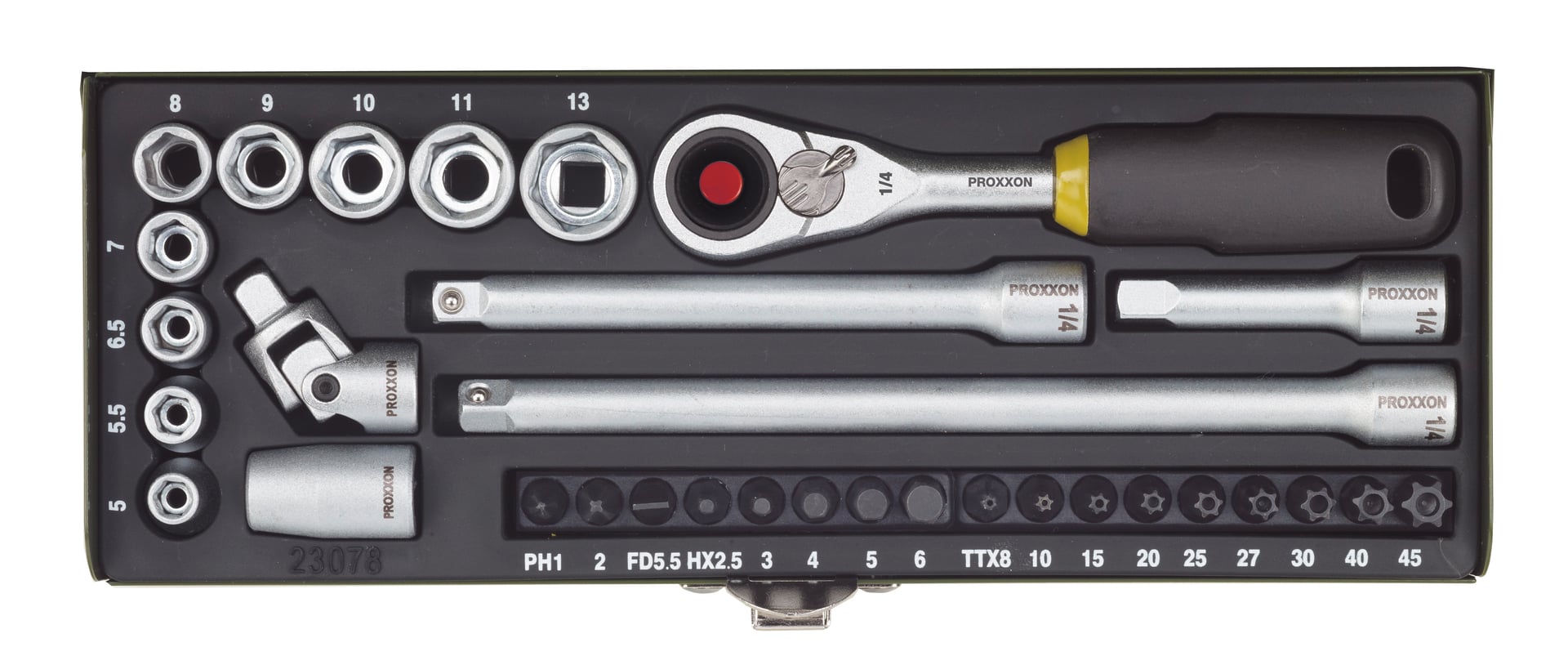 1 MICRO-Kompaktratsche (1/4″), 9 Steckschlüsseleinsätze 5 – 13 mm, 3 Verlängerungen 50 – 100 – 150 mm, Kreuzgelenk, female Adapter, 17 Sechskantbits (PH1 – 2; FD 5,5; HX 2,5 – 3 – 4 – 5 – 6; TTX 8 – 10 – 15 – 20 – 25 – 27 – 30 – 40 – 45)