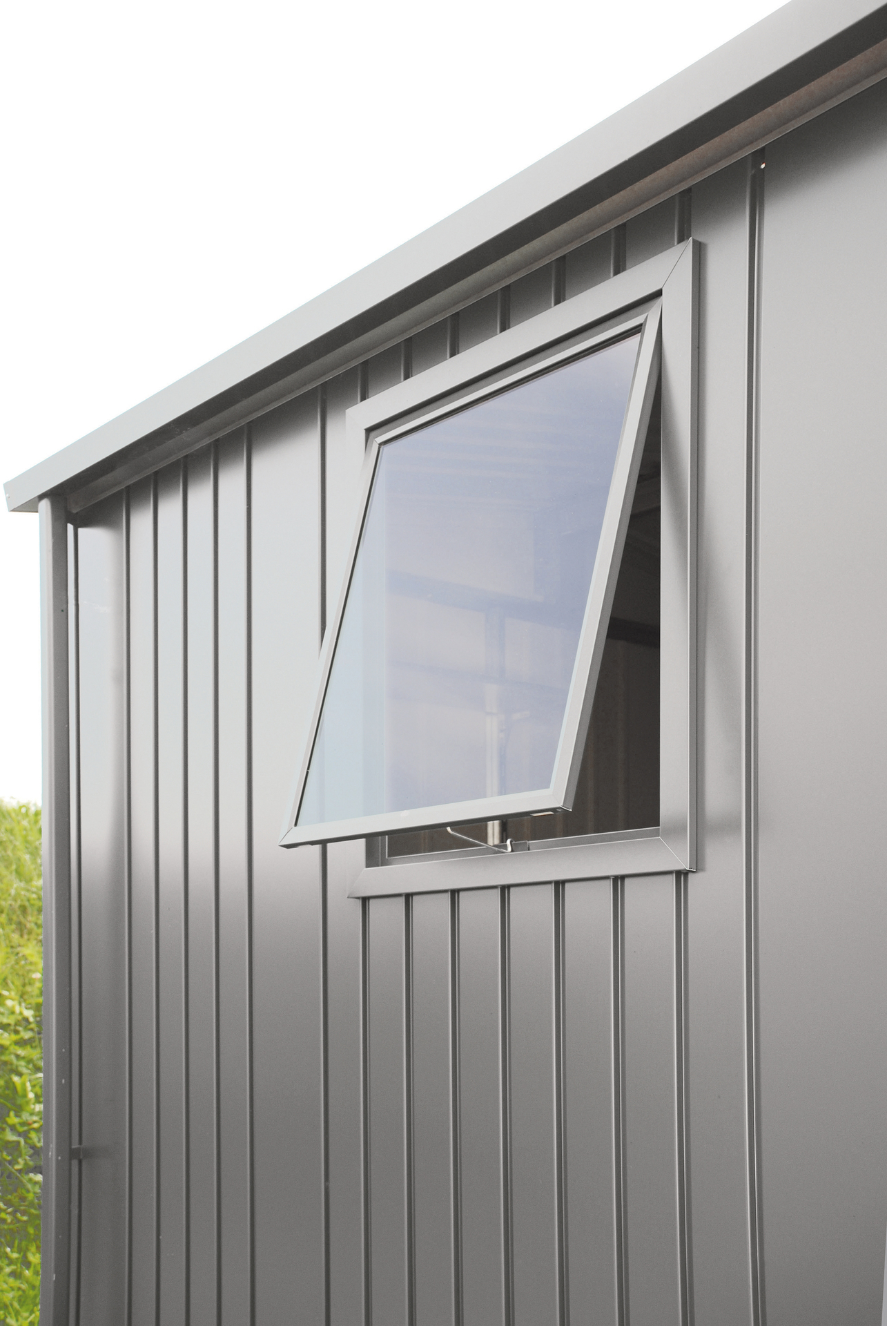 Das Seitenwandelement mit Metallrahmen-Ausstellfenster (Kunststoffglas) bringt noch mehr Tageslicht ins Gerätehaus und gewährt freie Sicht auf den Garten.