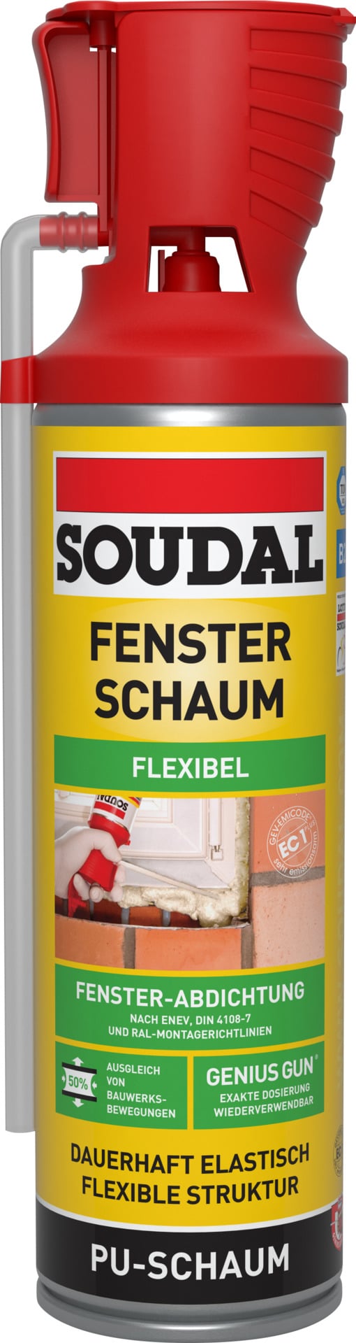 Fensterschaum Genius Gun ist ein elastischer einkomponentiger Polyurethanschaum mit sehr guter Wärme- und Schalldämmung. Hervorragend geeignet zum Verfüllen der Funktionsebene nach EnEV, DIN 4108-7 und RAL-Montagerichtlinien. Mit patentiertem GeniusGun-System.