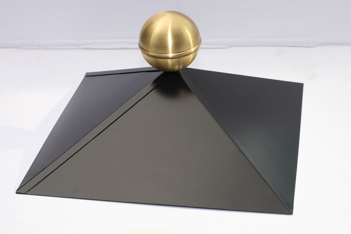 Die Firstkappe aus schwarz lackiertem Stahl mit goldener Messingkugel verschönert Ihren SKAN HOLZ 4-Eck Pavillon nicht nur, sondern dichtet das Dach auch nach oben gegen eindringende Feuchtigkeit ab. Der Durchmesser der Messingkugel beträgt ca. 8 cm.