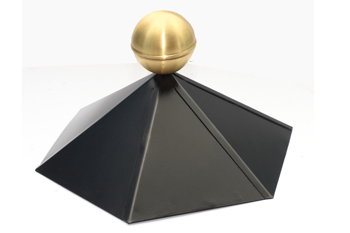 Die Firstkappe aus schwarz lackiertem Stahl mit goldener Messingkugel verschönert Ihren SKAN HOLZ 6-Eck Pavillon nicht nur, sondern dichtet das Dach auch nach oben gegen eindringende Feuchtigkeit ab. Der Durchmesser der Messingkugel beträgt ca. 8 cm.
