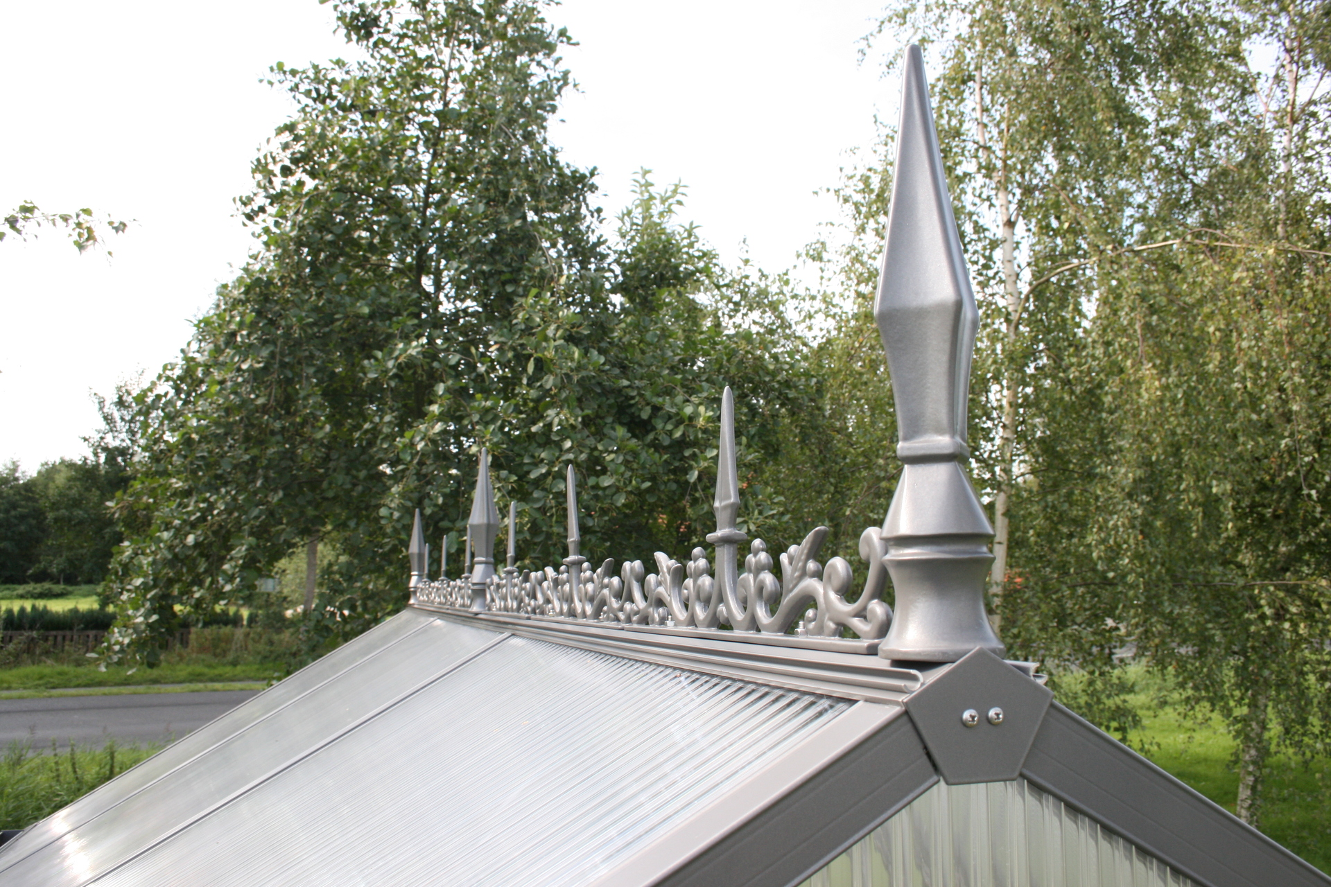 Die Firstverzierung aus Aluminium verleiht Ihrem Gewächshaus einen ganz besonderen Charme. Sie wird auf der ganzen Länge des Firstes Ihres Gewächshauses angebracht und kann auch nachträglich montiert werden. Mit den Zierelementen und Zierspitzen erreichen Sie im Handumdrehen eine Art “viktorianischen Baustil” für Ihr Gewächshaus. Die Firstverzierung ist für alle KGT Gewächshäuser mit Satteldach (außer Rhodo und Callas) geeignet.