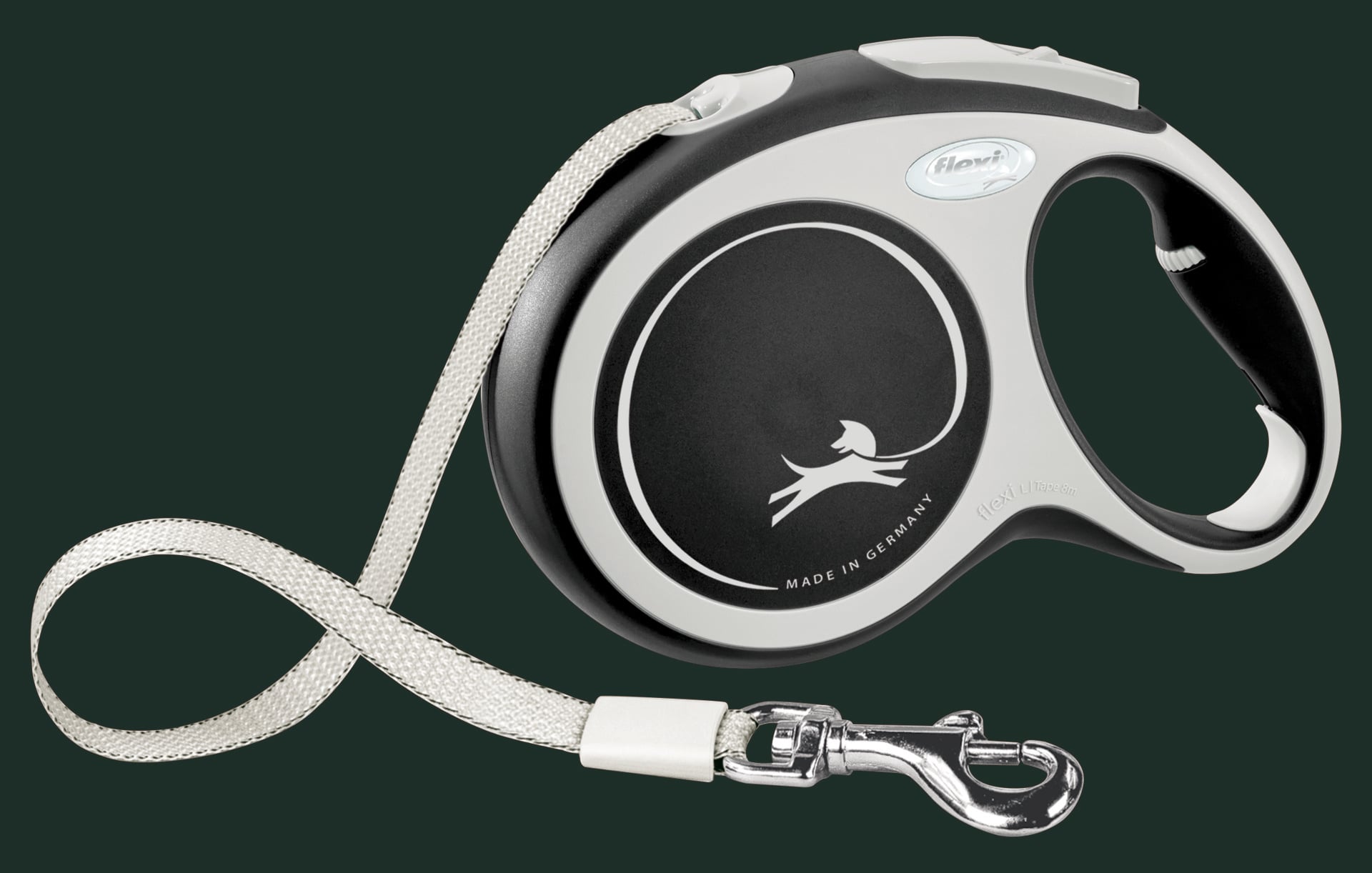 Komfortable Hunde-Flexileine mit Seil. Sie verfügt über ein Kurzhub-Bremssystem, Softkomponenten und einen verchromten Haken.