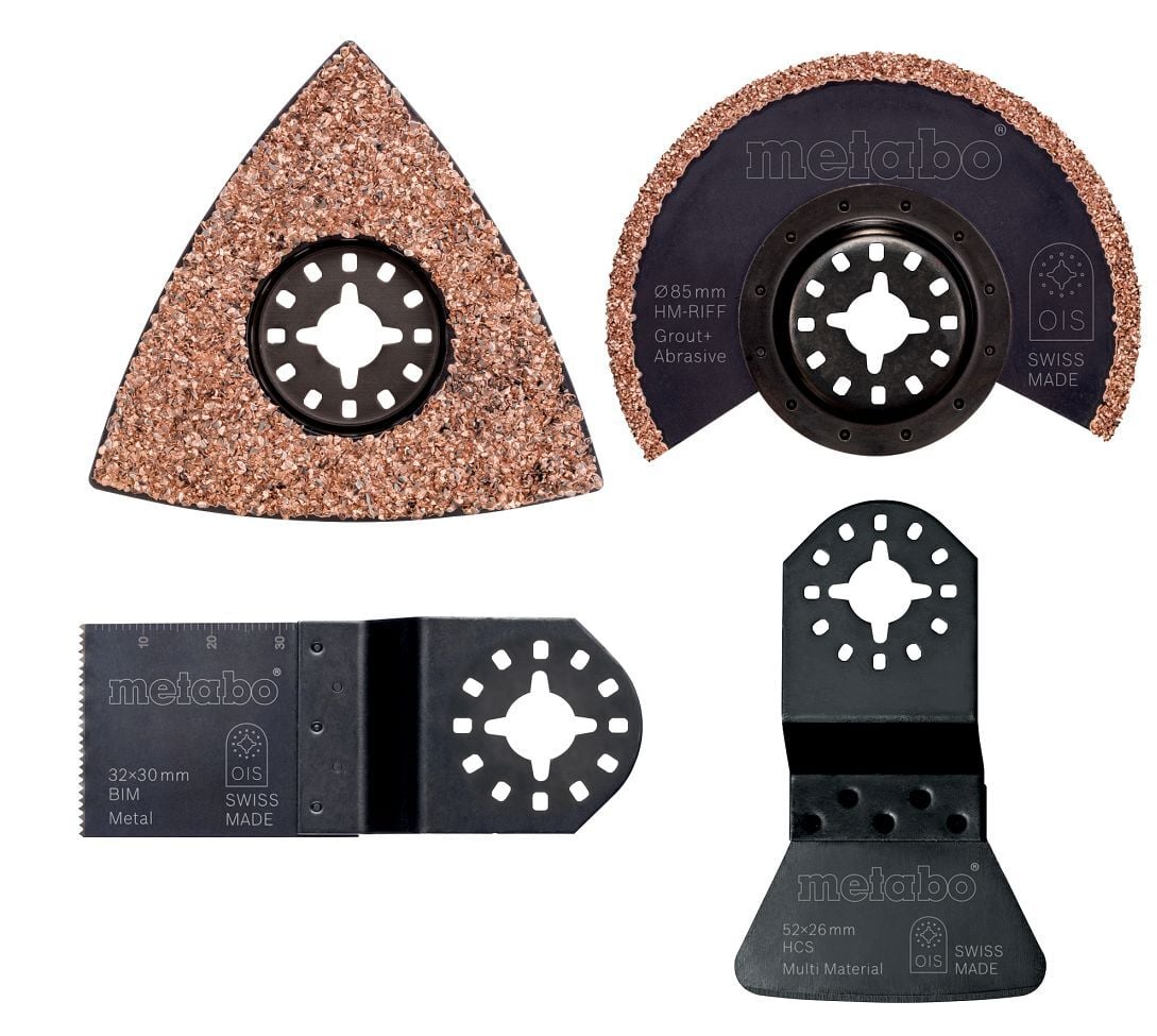 Set bestehend aus: 1 x Segmentsägeblatt 85 mm HM (Fliesen), 1 x Dreieckschleifplatte 78 mm HM (Fliesen), 1 x Schaber starr 52 mm HCS, 1 x Tauchsägeblatt 32 mm BiM (Metall)