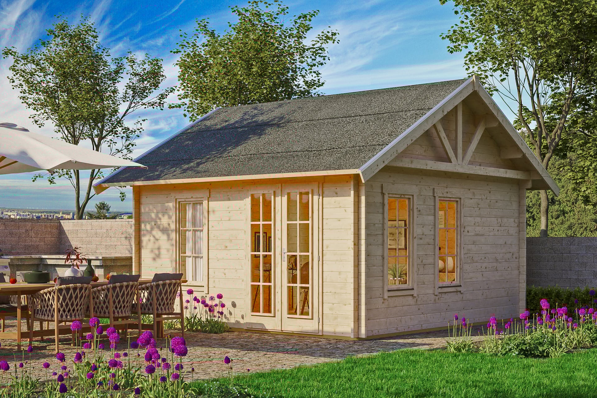 • Tür und Fenster mit Isolierglas und Gummidichtung sowie aufgesetztem Sprossenrahmen (Sprossenrahmen können wahlweise montiert oder weggelassen werden)