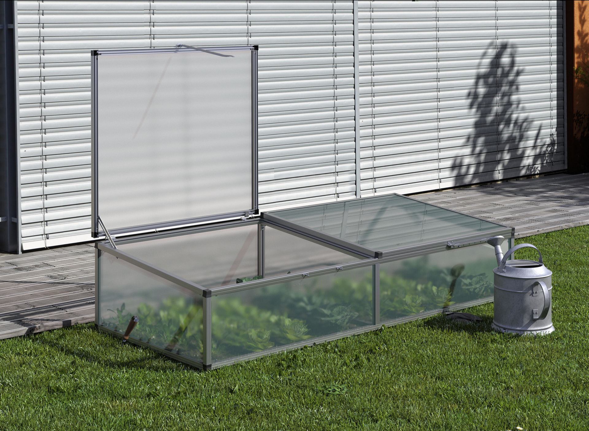 Schützen Sie Ihre jungen Pflanzen mit dem KGT Frühbeet 210. Das Mini-Gewächshaus, mit den Maßen 2,05 x 0,91 x 0,46 m (BxTxH) besteht aus transparenten 6-mm-ISO-Hohlkammerplatten aus hochbruchfestem Polycarbonat und sind UV-geschützt. Das Frühbeet 210 verfügt über zwei praktische, breite Öffnungsklappen, die sich über 90° öffnen lassen. Der Handaufsteller ermöglicht, den Deckel in verschiedenen Aufstellpositionen zu öffnen und dient gleichzeitig als Verschlussmechanismus. So gedeihen Ihre Pflanzen sicher und geschützt.