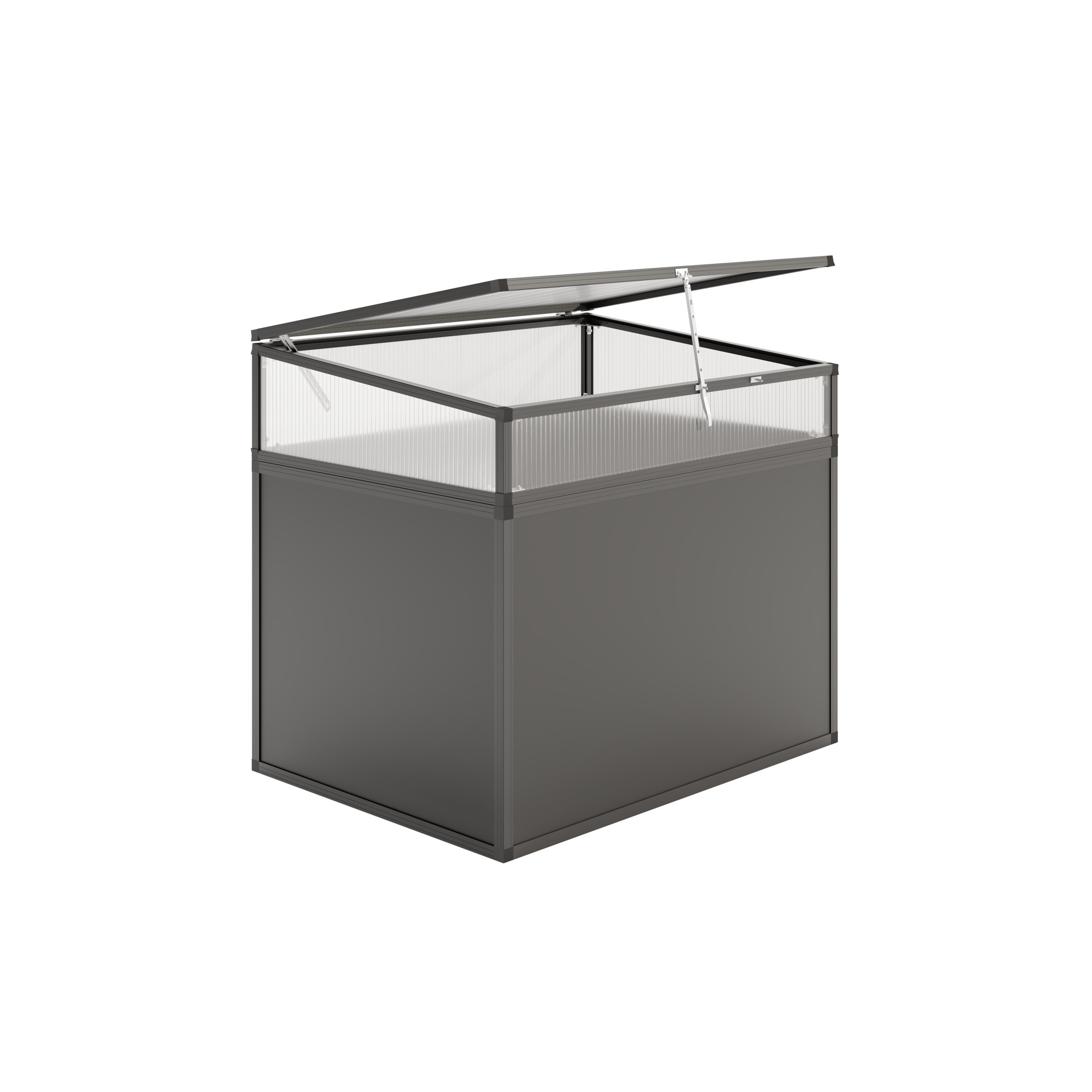 Schützen Sie Ihre jungen Pflanzen mit dem KGT Frühbeetaufsatz 130 in der Farbe anthrazit-grau. Dieses Mini-Gewächshaus ist aus transparenten, UV-geschützten 6 mm ISO-Hohlkammerplatten aus hochbruchfestem Polycarbonat gefertigt. Die Aluminium-Konstruktion ist bei diesem Modell in anthrazit-grau beschichtet und bildet so eine perfekte optische Einheit mit Ihrem grauen Aluminium-Hochbeet. Mit den Abmessungen von 1,31 x 0,99 x 0,32 m (BxTxH) passt der Aufsatz perfekt sowohl auf das Holz-Hochbeet Woody 130 als auch auf das Aluminium-Hochbeet 130. Der Frühbeetaufsatz 130 ist mit einer praktischen, breiten Öffnungsklappe ausgestattet, die sich um 90° öffnen lässt. Der Handaufsteller ermöglicht verschiedene Aufstellpositionen des Deckels und fungiert gleichzeitig als Verschlussmechanismus. Auf diese Weise gedeihen Ihre Pflanzen in Ihrem Hochbeet sicher und geschützt.