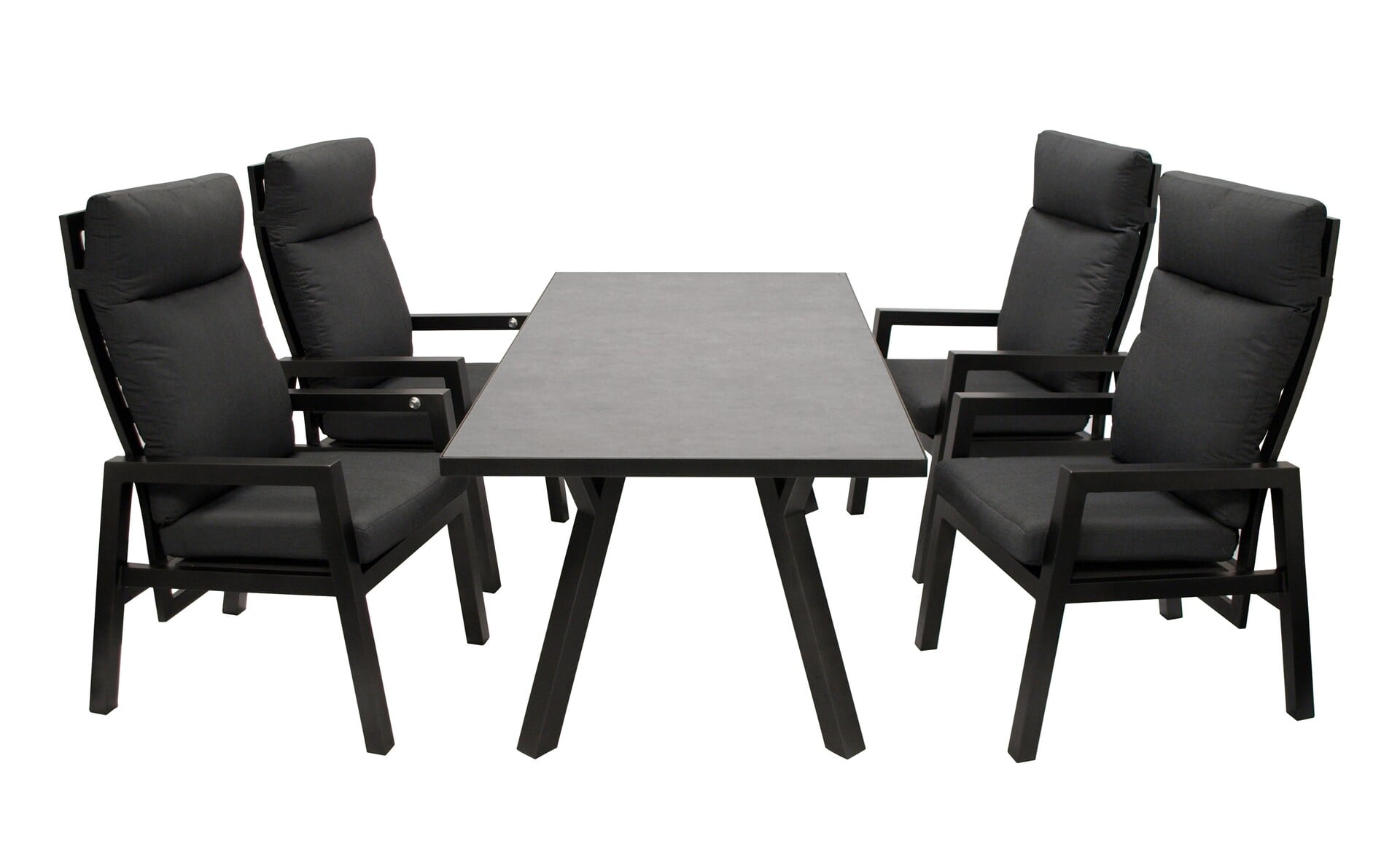 Garnitur 5-teilig (4x Hochlehner Sessel mit Armlehnen, 1x Tisch 180x90cm), Gestell Aluminium dunkelgrau pulverbeschichtet, Tischplatte Glas in Keramikoptik dunkelgrau. Rückenlehnen über Gasdruckfeder verstellbar. Lieferung inkl. Polster in grau. Materialzusammensetzung Bezüge: 100% Polyester.