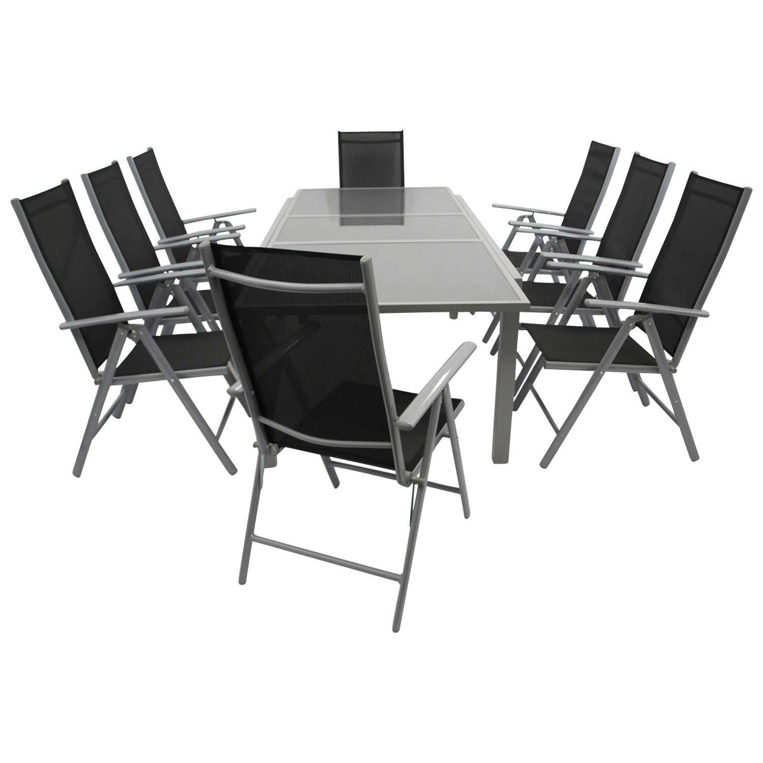 Garnitur 9-teilig (8x Klappsessel mit Aluminiumgestell grau, Bespannung Textilene schwarz, 1x Ausziehtisch 180/240x100cm, Aluminium + Glas).