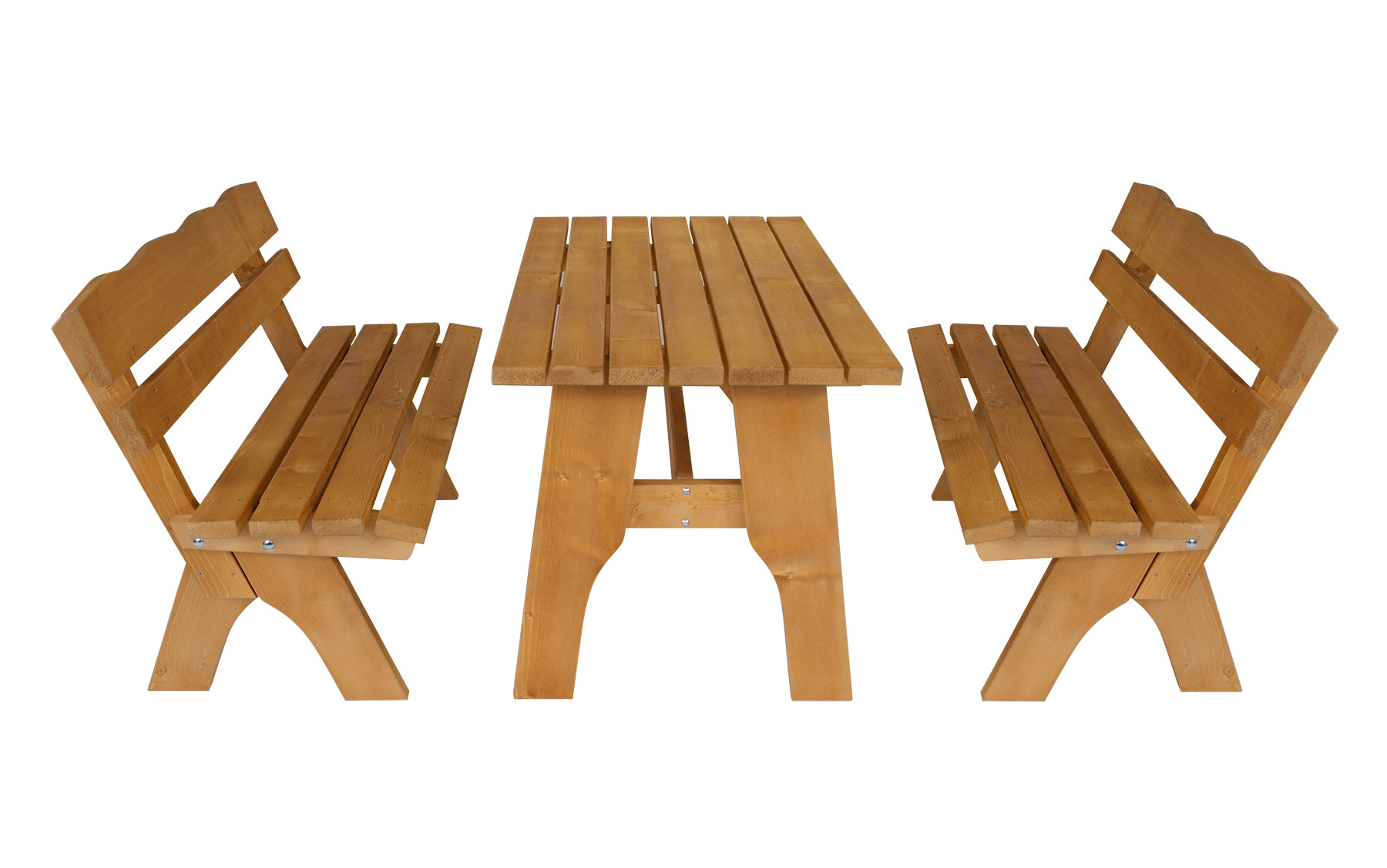 – Farbe: natur, – Im Set enthalten: 2 Bänke + 1 Tisch, – Maße: Tisch 120x70x72cm, Bank 120x60x82cm, – Material: Kiefer massiv, – Produktart: Garnitur