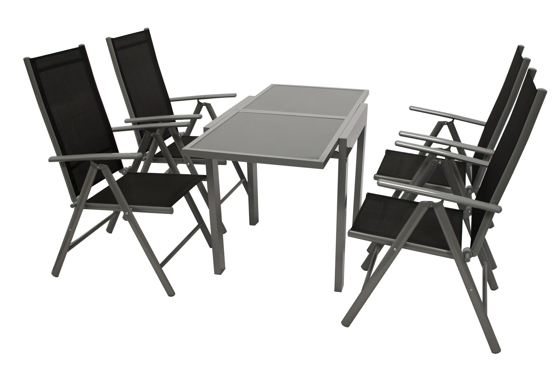Mehrteilige Sitzgarnitur mit Kunststoffgewebebezug. Die Klappsessel verfügen über Armlehnen und der Tisch ist ausziehbar.