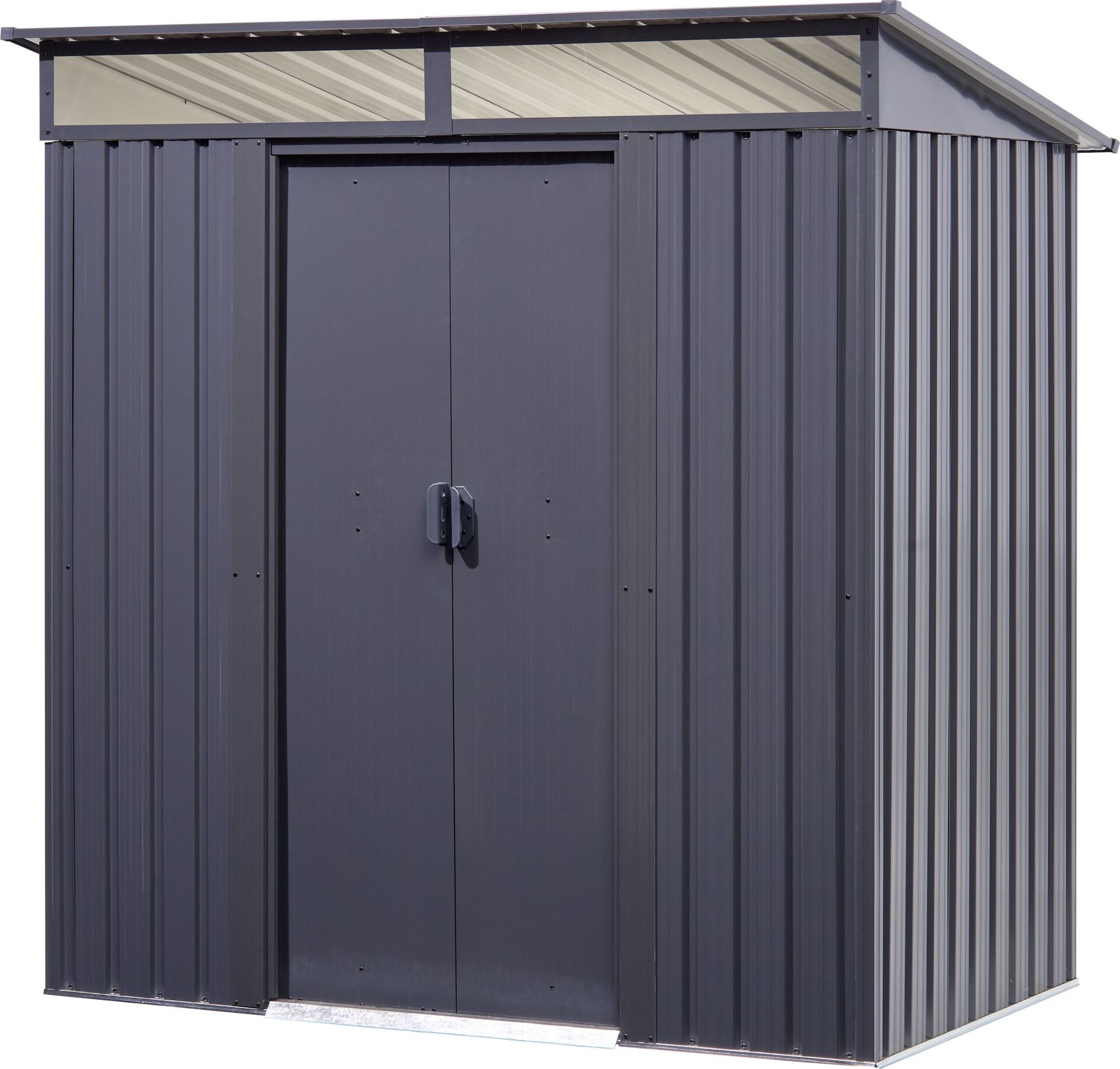 Das Gerätehaus mit Pultdach ist eine ideale Lösung zum Verstauen und Lagern Ihrer Gartengeräte, Werkzeuge und Hilfsmittel. Das stabile Gerätehaus besteht aus einem verzinkten Bodenrahmen und profilierten Stahlblech-Seitenwänden. Oberhalb der breiten Doppel-Schiebetu?r befindet sich eine durchgehende Oberlicht-Leiste, durch diese Tageslicht in das Gerätehaus fällt. Die Schiebetu?ren sind mit Kunststoff-Griffen ausgestattet und lassen sich bei Bedarf absperren (ein Vorhängeschloss ist im Lieferumfang nicht enthalten).