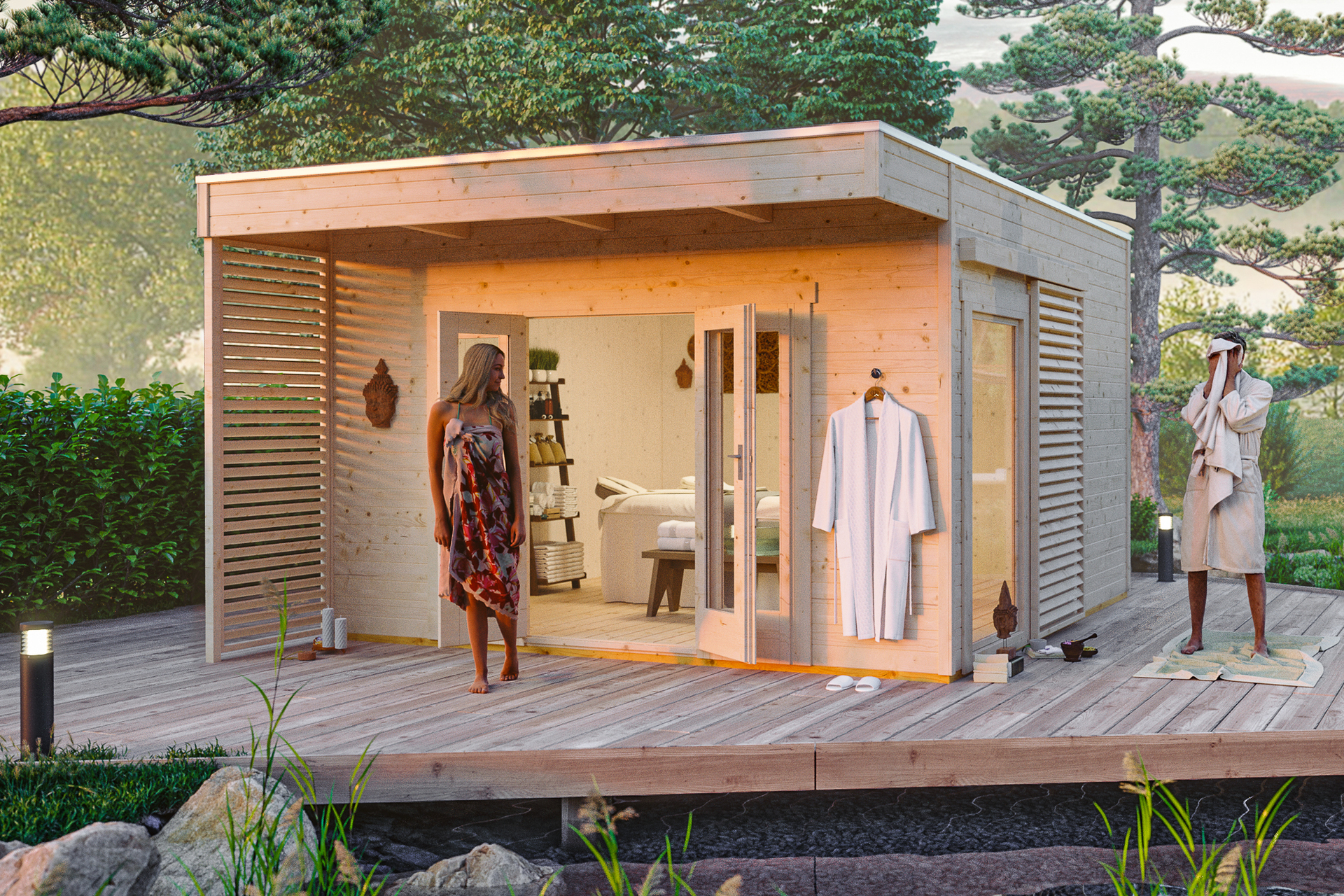 zwei Lamellenelemente, davon eins zum Verschieben, 19 mm Wandbohlen, Isoliermaterial für Dach und Wände, Innenwandverschalung 14 mm, Fußboden 19 mm inkl. imprägnierten Grundlagern, Tür und Fenster mit Isolierglas und Gummidichtung, 2 festestehende Fenster und ein Dreh-Kipp- Fenster, Dach 19 mm Profilschalung mit Aluminiumabschlusskante, inkl. selbstklebender KSK-M Dachbahn