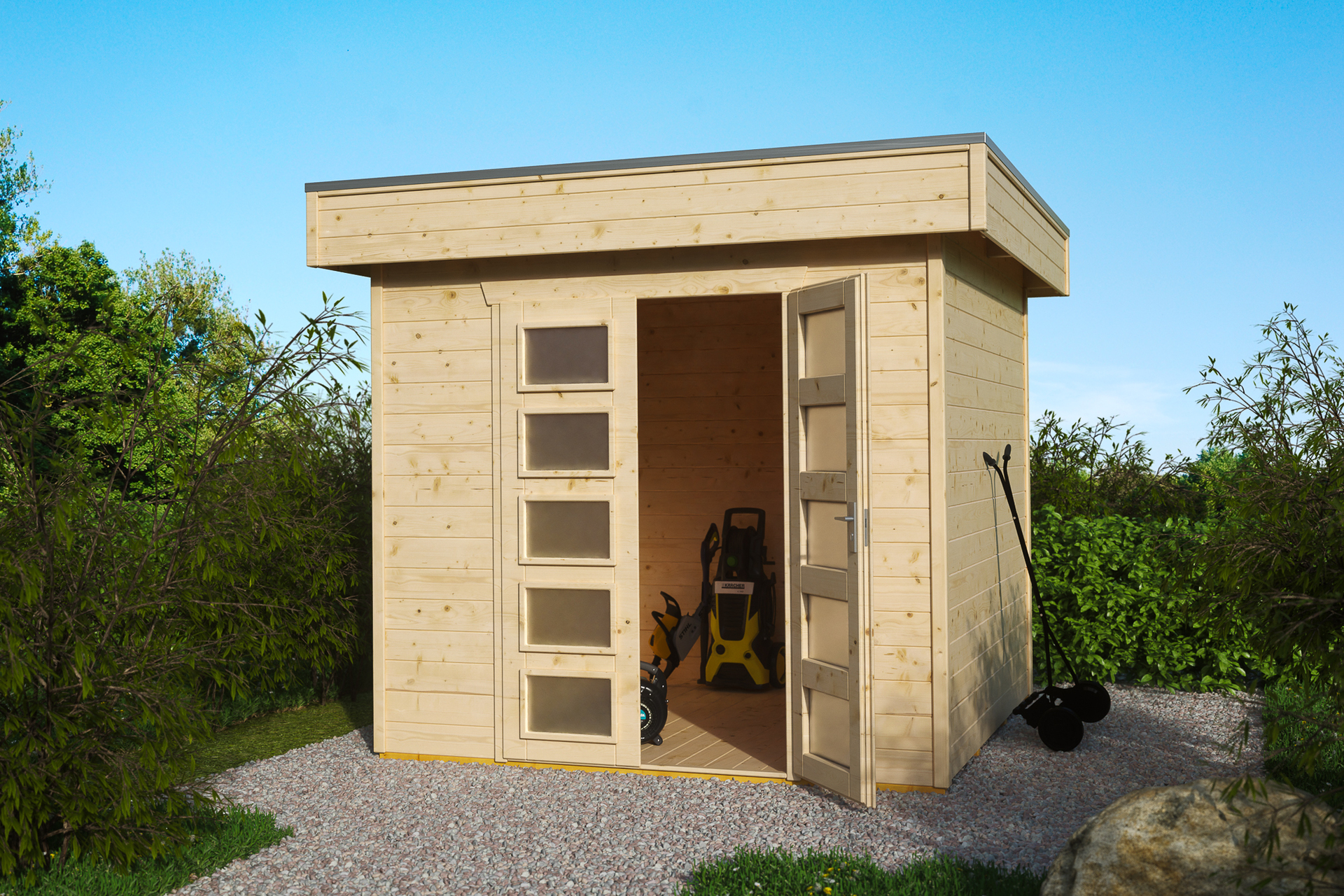 Das Dach besteht aus 19 mmDachschalung und einer Aluminium-Abschlusskante. Aufgrund der geringen Dachneigung ist eine Eindeckung mit Dachschindeln nicht möglich. Wir empfehlen die Eindeckung mit KSK-M Dachbahnen (sind optional als Zubehör erhältlich). Das Gefälle verläuft nach hinten.