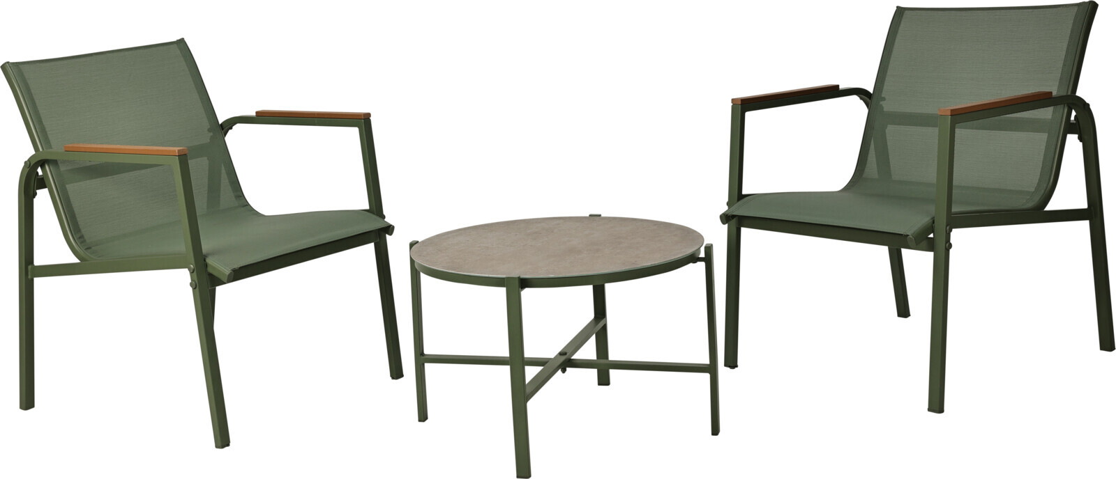 Möbel-Set, Stahlgestell, Textilien, grün, Holzarmlehne, 3 tlg. (2 Stühle, 1 Tisch)