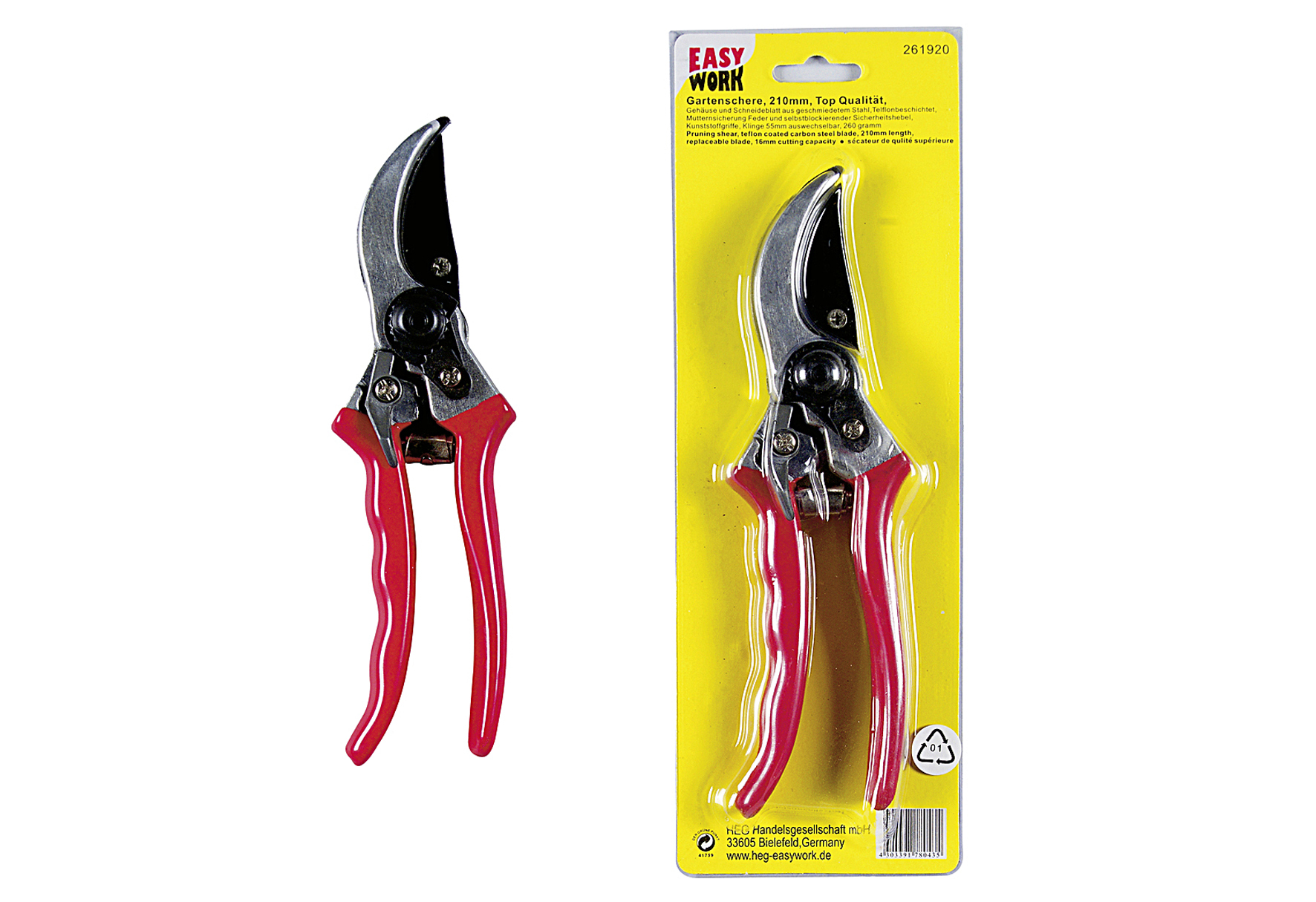 – Gewicht: 200, – Länge: 210, – Material: geschmiedeter Stahl (Gehäuse und Schneide) Kunststoff (Griffe)