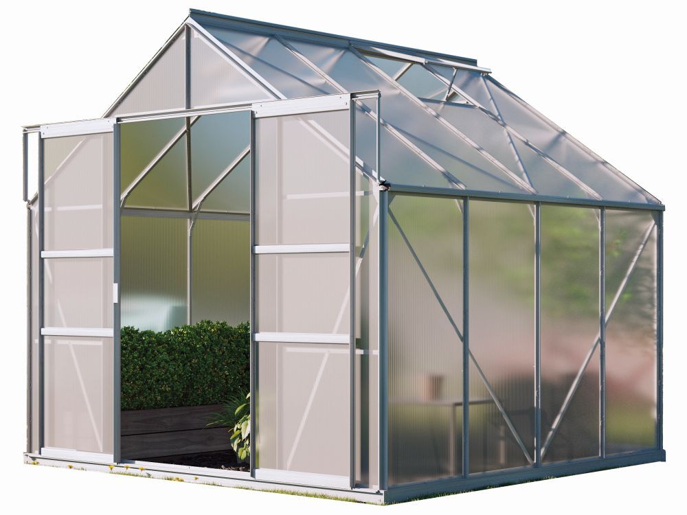 Gewächshaus 6700/6 DT – Die Eindeckung aus Hohlkammerplatten (HKP) sorgt für solide Isoliereigenschaften. Sie federn Temperatureinbrüche wie zu Saisonbeginn und besonders nachts ab, aber schützen die Pflanzen auch vor zu intensiver Sonneneinstrahlung. So müssen sich Einsteiger um beides nur bedingt kümmern, wenn das Gewächshaus richtig eingedeckt ist. Im Vergleich zu Glas sind Hohlkammerplatten zudem bruchsicherer und leichter. Das aufstellbare Dachfenster gewährt eine optimale Belüftung, vor allem an heißen Tagen. Neben den Dachfenstern gehören auch die Regenrinnen zur Standardausstattung. Für den ebenerdigen und rechtwinkligen Aufbau des Gewächshauses ist ein Fundamentrahmen (H 12,5 cm) aus verzinktem Stahlblech besonders hilfreich (Zusatzartikel nicht im Lieferumfang enthalten).