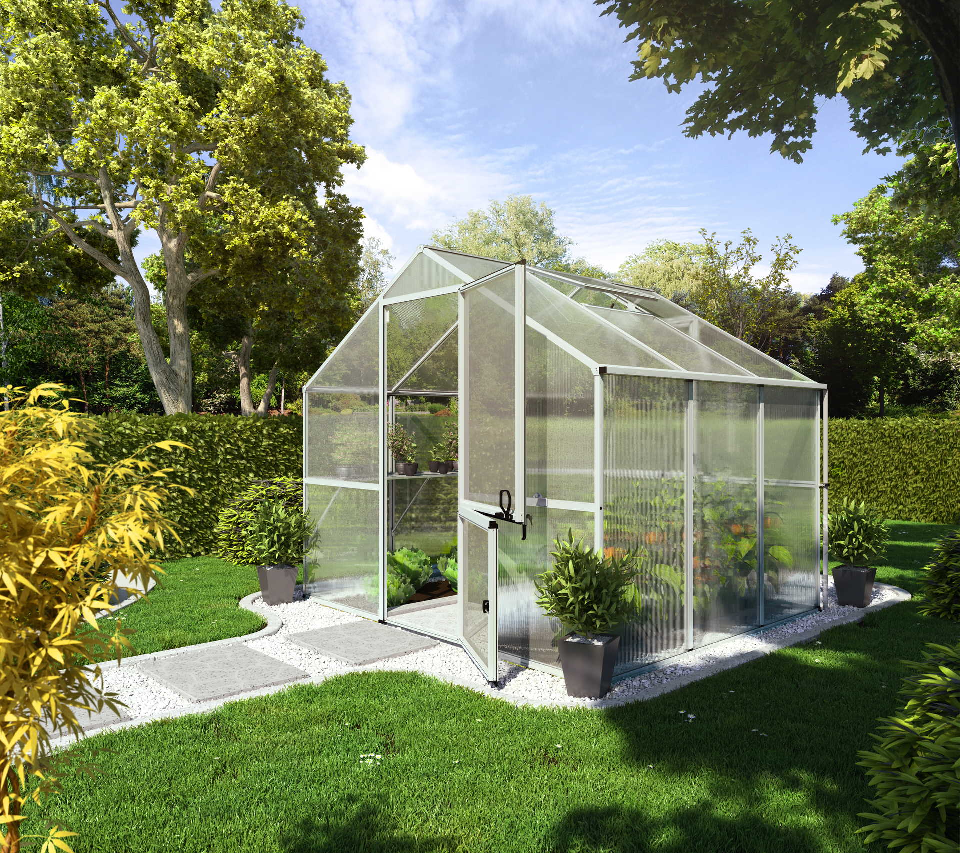 – Breite: 2,67, – Farbe: pressblank, – Fenster: 1 Fenster, – Firsthöhe: 2120mm, – Fläche: 6,06m², – Höhe: 2,27, – Länge: 2,27, – Material: Aluminium, – Produktart: Gewächshaus, – Stärke Verglasung: 6mm, – Türart: Geteilte Drehtür (abschließbar), – Türmaße: 1830x770mm (HxB), – Verglasung: Hohlkammerplatten aus hochbruchfestem Polycarbonat