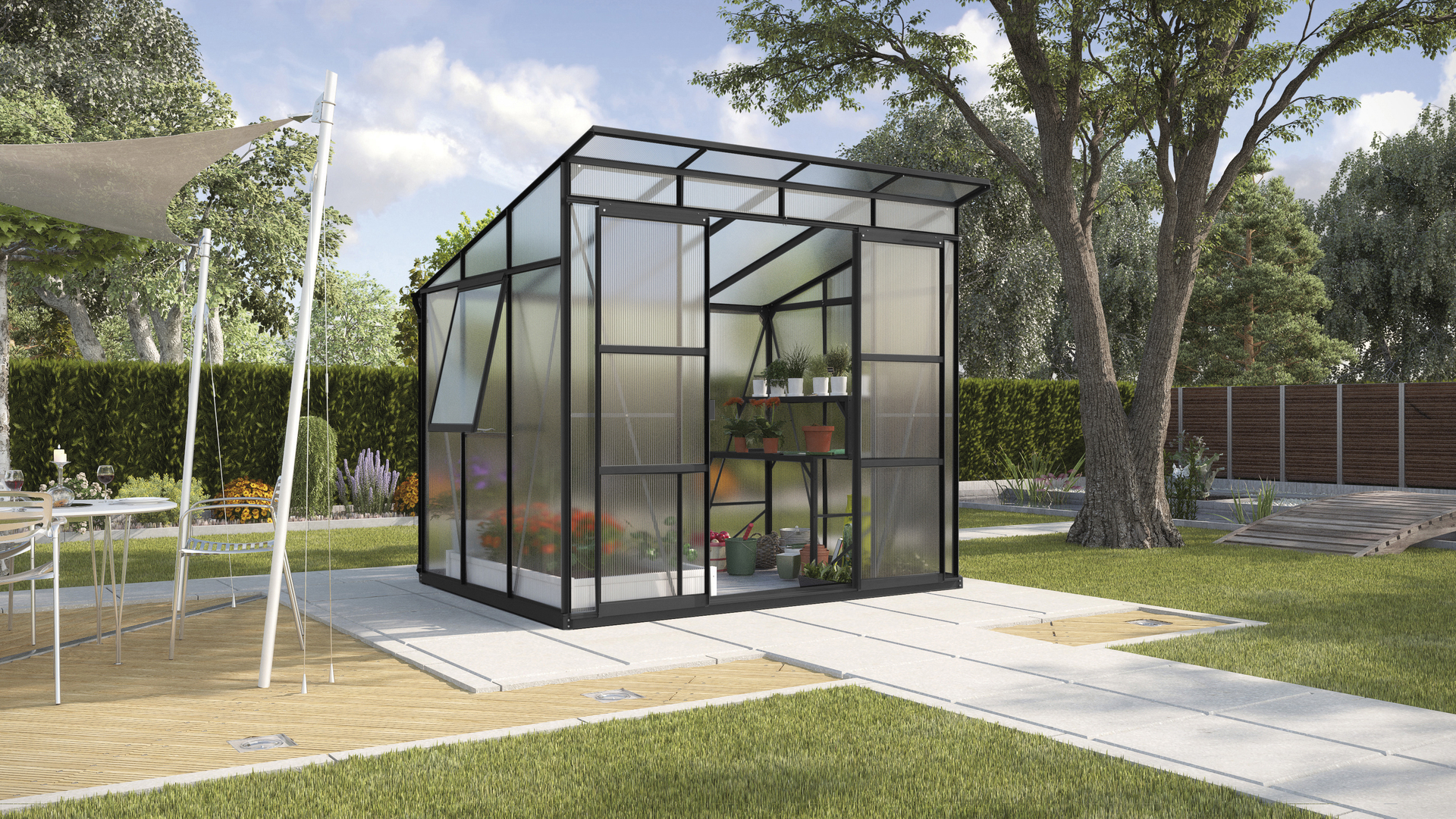 Mit diesem Gewächshaus setzen Sie architektonische Akzente in Ihrem Garten. Konzipiert mit einem Pultdach, breiter Front und hohen Seitenwänden besticht es durch ein großzügiges Design. Das Modell ist in zwei verschiedenen Größen mit den Grundflächen 5,9 und 7,6 m², in zwei Verglasungsartungen und in zwei Farben erhältlich: Aluminium eloxiert oder Anthrazit pulverbeschichtet. Die Kombiverglasung besteht in den Seiten aus ca. 3 mm starkem Sicherheitsglas, kristallklar (ESG) und im Dachbereich aus ca. 6 mm starken Hohlkammerplatten (HKP). Diese schützen die Pflanzen gegen zu starke Sonneneinstrahlung, sorgen für eine ausgeglichene Temperatur und sind weniger empfindlich gegen herabfallende Äste oder dergleichen. Das leicht geneigte Dach lässt viel Sonne in das Gewächshaus. Mit Seitenwänden und -fenstern aus Hohlkammerplatten kann das Freya in seinen Isoliereigenschaften optimiert werden, empfehlenswert z.B. bei einem geplanten Einsatz im Winter. Der geringe Höhenunterschied des Pultdachs gewährleistet durchgehend eine angenehme Stehhöhe und bietet hochwachsenden Pflanzen genügend Raum sich frei zu entfalten. Ein bis zwei aufstellbare Seitenfenster geben dem Haus wohnliches Flair. Die leichtgängige, breite Doppelschiebetür mit einer Breite von 1,22 m und einer Höhe von 1,92 m bietet großzügigen Zugang und eine zusätzliche Belüftungsmöglichkeit. Die Regenrinne und zwei Regenfallrohre (L 1,50 m, Ø 32 mm) gehören ebenfalls zur Standardausstattung. Das Modell 7600 ist zusätzlich mit einem Lamellenfenster ausgestattet. Das Gerüst besteht aus schmalen Aluminiumleisten. Da Aluminium ein extrem stabiles und widerstandsfähiges Material ist, genügen die feinen Leisten um langfristig für einen stabilen Stand zu sorgen. So ist Ihnen andauernde Freude an Ihrem Gewächshaus garantiert.