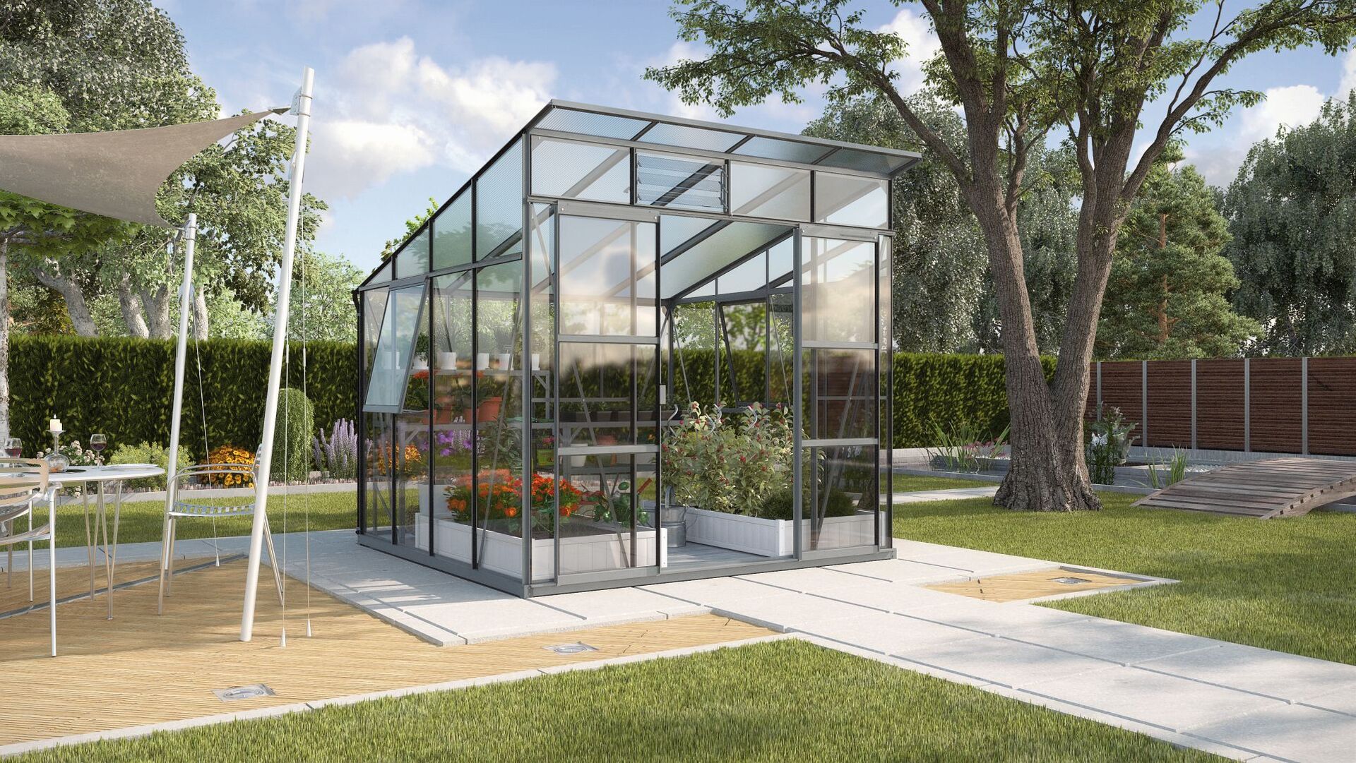 Mit diesem Gewächshaus setzen Sie architektonische Akzente in Ihrem Garten. Konzipiert mit einem Pultdach, breiter Front und hohen Seitenwänden besticht es durch ein großzügiges Design. Das Modell ist in zwei verschiedenen Größen mit den Grundflächen 5,9 und 7,6 m², in zwei Verglasungsartungen und in zwei Farben erhältlich: Aluminium eloxiert oder Anthrazit pulverbeschichtet. Die Kombiverglasung besteht in den Seiten aus ca. 3 mm starkem Sicherheitsglas, kristallklar (ESG) und im Dachbereich aus ca. 6 mm starken Hohlkammerplatten (HKP). Diese schützen die Pflanzen gegen zu starke Sonneneinstrahlung, sorgen für eine ausgeglichene Temperatur und sind weniger empfindlich gegen herabfallende Äste oder dergleichen. Das leicht geneigte Dach lässt viel Sonne in das Gewächshaus. Mit Seitenwänden und -fenstern aus Hohlkammerplatten kann das Freya in seinen Isoliereigenschaften optimiert werden, empfehlenswert z.B. bei einem geplanten Einsatz im Winter. Der geringe Höhenunterschied des Pultdachs gewährleistet durchgehend eine angenehme Stehhöhe und bietet hochwachsenden Pflanzen genügend Raum sich frei zu entfalten. Ein bis zwei aufstellbare Seitenfenster geben dem Haus wohnliches Flair. Die leichtgängige, breite Doppelschiebetür mit einer Breite von 1,22 m und einer Höhe von 1,92 m bietet großzügigen Zugang und eine zusätzliche Belüftungsmöglichkeit. Die Regenrinne und zwei Regenfallrohre (L 1,50 m, Ø 32 mm) gehören ebenfalls zur Standardausstattung. Das Modell 7600 ist zusätzlich mit einem Lamellenfenster ausgestattet. Das Gerüst besteht aus schmalen Aluminiumleisten. Da Aluminium ein extrem stabiles und widerstandsfähiges Material ist, genügen die feinen Leisten um langfristig für einen stabilen Stand zu sorgen. So ist Ihnen andauernde Freude an Ihrem Gewächshaus garantiert.