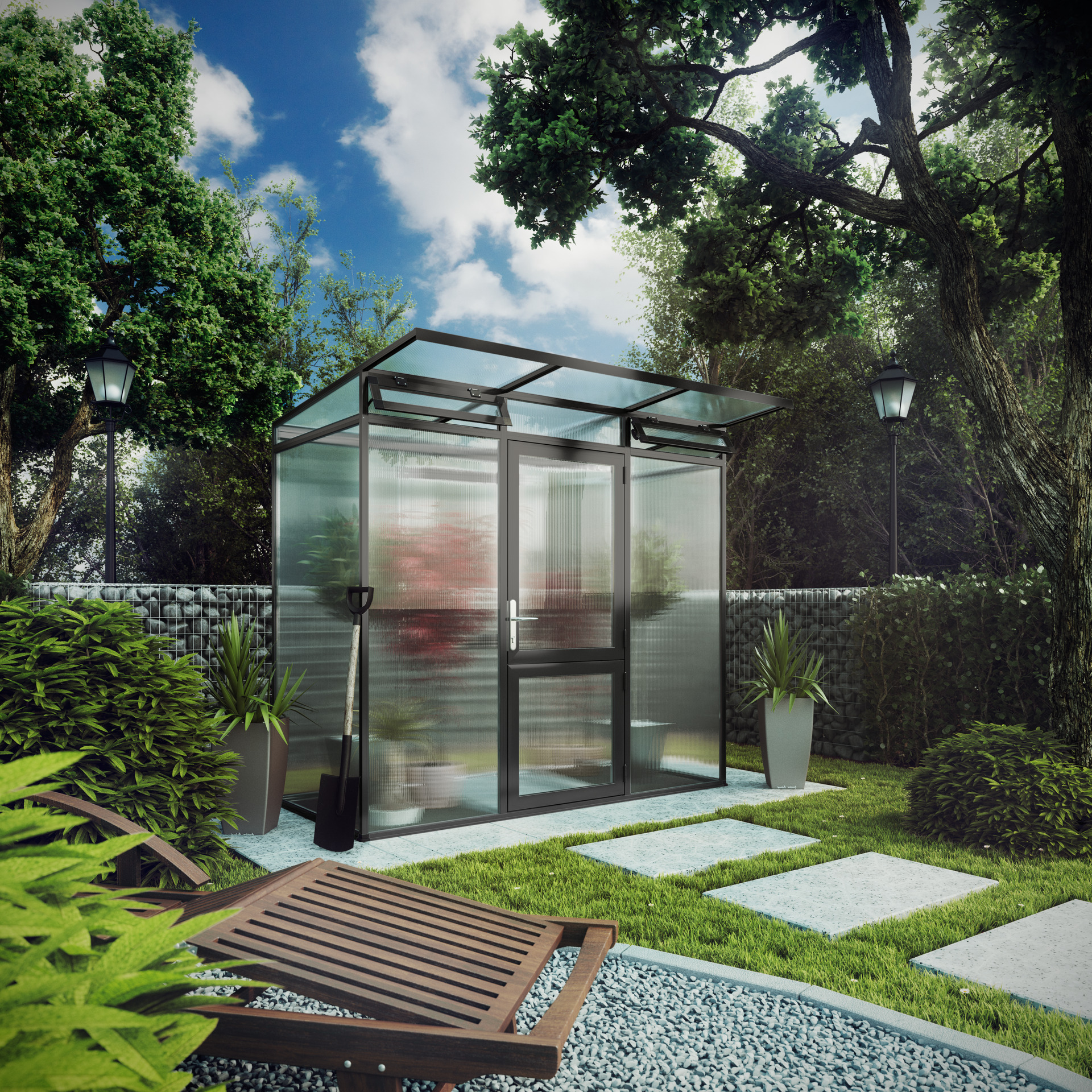 Das Pultdach-Gewächshaus Linea (Farbe: anthrazit-grau DB 703) mit 10 mm Hohlkammerplatten besticht nicht nur durch sein harmonisches Design. Die Bauweise mit Pultdach sorgt auch für einen hohen Lichteinfall und die angenehme Stehwandhöhe ermöglicht ergonomisches Gärtnern. Dank der durchgängigen Aluminiumprofile und der ausgereiften Verglasungstechnik, ohne Klammern und Kunststoffleisten ist nicht nur enorme Stabilität, sondern auch hohe Sicherheit gewährleistet. Die breite, geteilte Drehtür mit abschließbarem Türgriff sorgt für einen bequemen und geschützten Zugang in Ihr Gewächshaus. Das große Rückwandfenster inkl. Handaufsteller ermöglicht in Kombination mit den zwei vorderen Aufstellfenstern – ebenfalls mit Handaufstellern – eine gute Belüftung, sodass Ihren Pflanzen an nichts mangeln wird. Über die Dachrinne mit Fallrohr lässt sich Regenwasser zur Bewässerung sammeln. Sie können das Gewächshaus mit dem KGT Hängebord, Tischgestell oder der Pflanzwanne erweitern.
