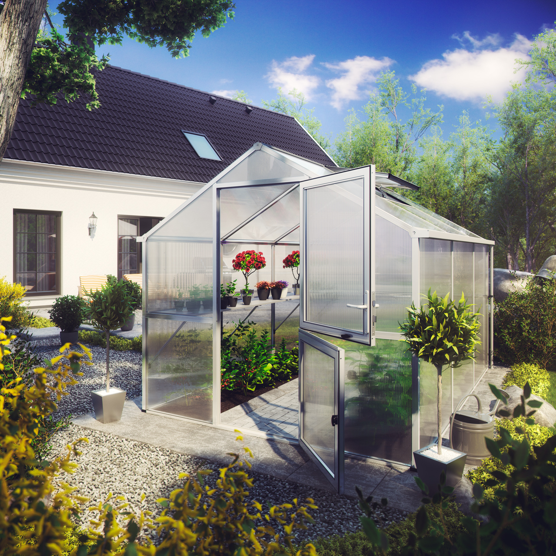 Das Aluminium- Gewächshaus Tulpe (Farbe: Aluminium pressblank) wurde speziell für den anspruchsvollen Hobbygärtner entwickelt. Die transparenten ISO-Hohlkammerplatten haben eine Stärke von 16 mm und werden komplett von den Profilen umschlossen, so dass ein Herumfliegen der Platten ausgeschlossen ist. Es werden keine Klammern oder ähnliche Kleinteile zur Befestigung der Hohlkammerplatten verwendet. Die Verglasung trägt somit einen großen Teil zur Stabilität bei. Eine Beschattung ist grundsätzlich nicht erforderlich, da keine UV-Strahlen durch die Hohlkammerplatten eindringen und Ihre Pflanzen somit vor dem Verbrennen geschützt werden. Ein weiterer Vorteil der Hohlkammerplatten ist der hohe Isolierwert, durch den die nützliche Wärme länger im Gewächshaus gespeichert wird. Durch die Stehwandhöhe von 1,49 m und einer großzügigen Firsthöhe von 2,15 m (Tulpe III) bzw. 2,33 m (Tulpe IV) ist jede Menge Raum für Sie und Ihre Pflanzen vorhanden. So können auch Tomaten und Gurken problemlos in die Höhe wachsen und sich vollends entfalten. Neben der geteilten Drehtür und dem Rückwandfenster mit Handaufsteller verfügt das Gewächshaus Tulpe über ein Dachfenster mit automatischem Fensterheber. Damit wird eine optimale Be- und Entlüftung gewährleistet. Um zu sichern was Ihnen lieb ist, ist im Standard-Lieferumfang eine hochwertige, abschließbare Hoppe-Drückergarnitur enthalten. Das Design der einzigartigen Tür wird durch die leichtgängigen, innenliegenden Türscharniere abgerundet. Mit dem Standardlieferumfang erhalten Sie zusätzlich eine beidseitige Regenrinne mit Fallrohren (Länge: 1,40 m). Alle wichtigen Profile (First-, Rinnen- und Bodenprofile) sind in einem Stück ausgeführt und sorgen für extra hohe Stabilität. Potenzielle Leckagen werden somit ebenfalls vermieden.