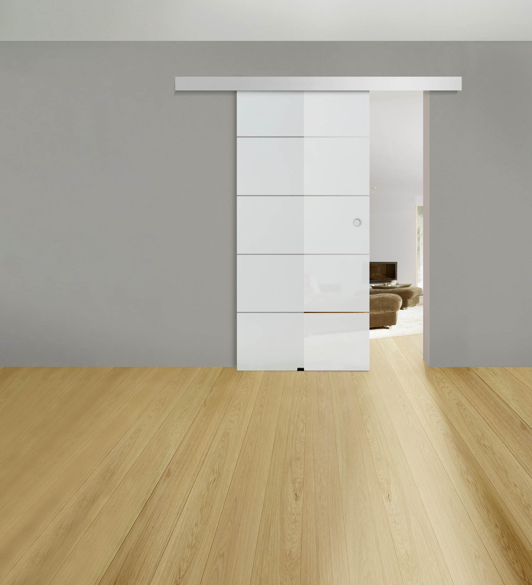 Ohne Bodenschiene läuft sie vor der Wand dank einer Aluminium-Laufschiene mit Rollenführung.