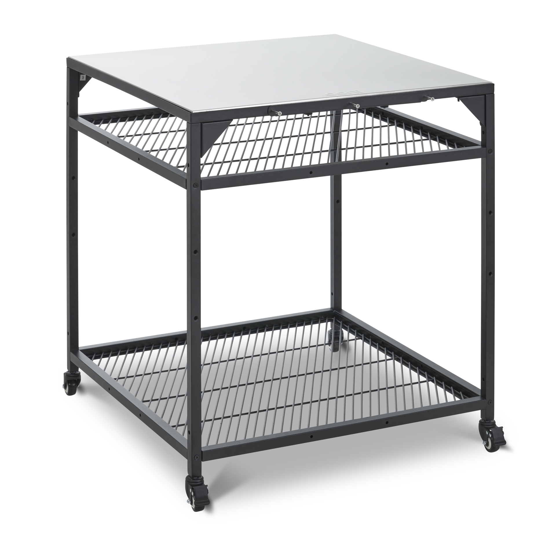 Unsere Tische werden aus robustem pulverbeschichtetem Karbonstahl hergestellt. Sie verfügen auch über zwei höhenverstellbare Einlegeböden sowie integrierte Haken für deine Ooni Pizzaschieber und das Zubehör. Dank der zwei feststellbaren Rollen steht dein Tisch beim Kochen sicher.