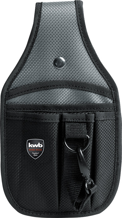 Werkzeug-Gürteltasche aus Nylon in Schwarz/Silber, doppelte Nahtreihe abgesetzt mit silbernem Faden, der Metallbügel ist mit 4 Nieten für den sicheren Halt befestigt, robuste Qualität, 2 große und 3 kleine Fächer, Hammerschlaufe, Schlaufe mit Karabinerhaken, Gürtelschlaufe mit Druckknopf, inkl. kwb WORK WEAR Label, für Gürtel bis 7 cm Breite, 270 x 150 mm.