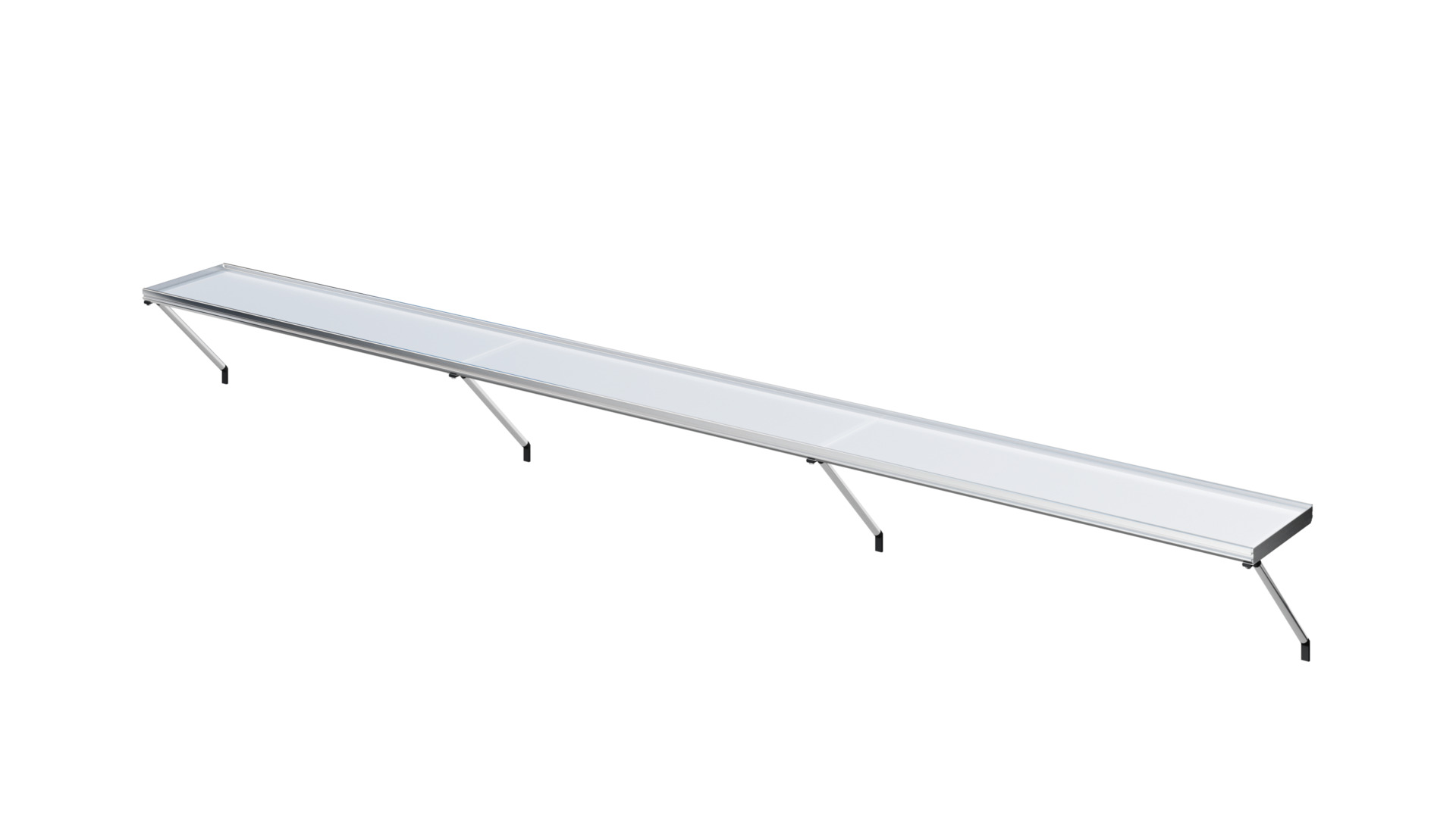 Das praktische KGT Hängebord ist aus hochwertigem Aluminium gefertigt und sorgt für Ordnung im Gewächshaus. Es verläuft über die gesamte Seitenwand des Gewächshauses. Die hochbruchfesten Kunststoff-Einlegeplatten sind individuell herausnehmbar und leicht zu reinigen. Dank der intelligenten Befestigung am Gewächshaus sind alle tragenden Einrichtungsteile hoch belastbar. Die Tiefe des Hängebords beträgt ca. 26 cm.