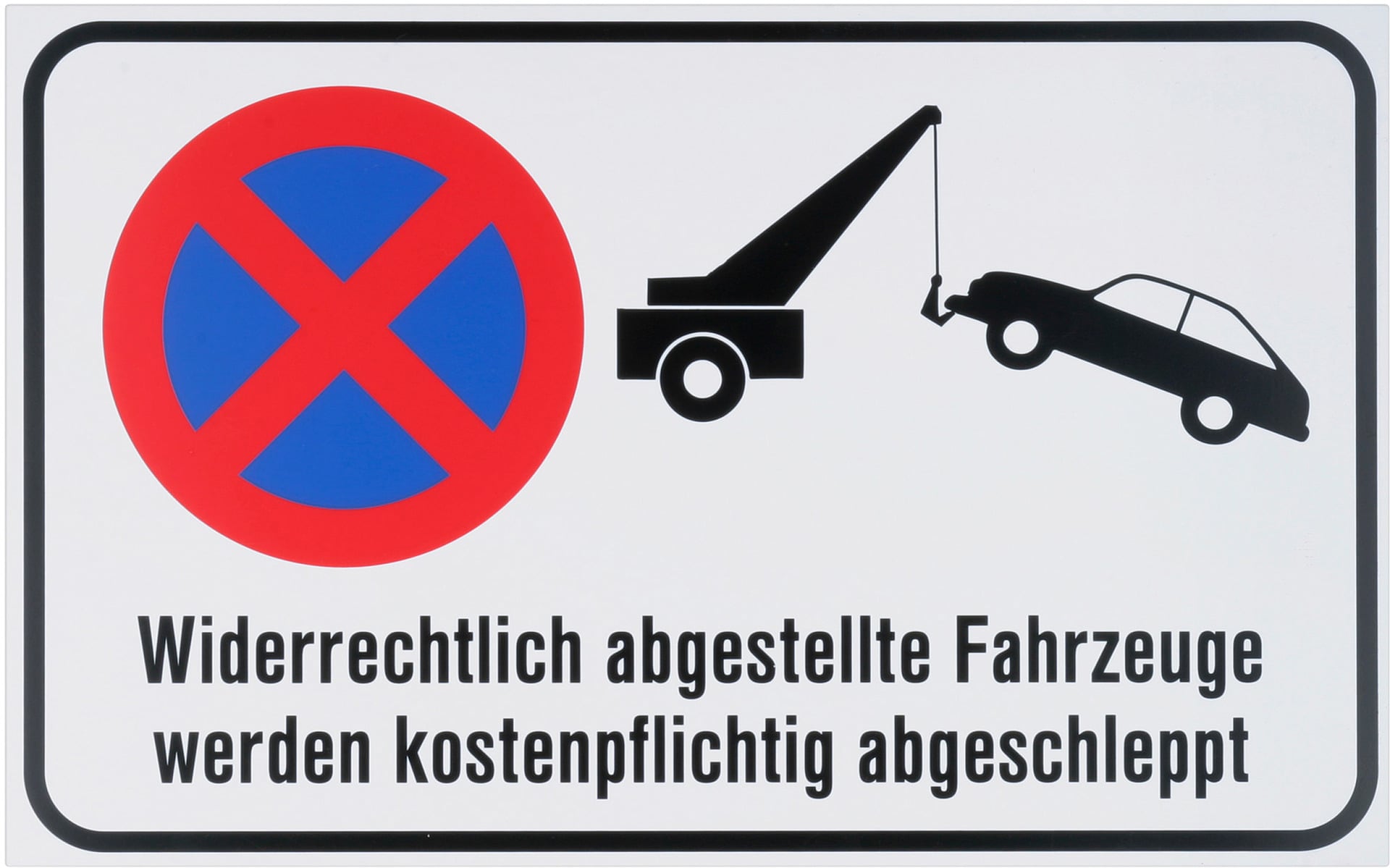 – Kompletter Text: Widerrechtlich abgestellte Fahrzeuge werden kostenpflichtig abgeschleppt!