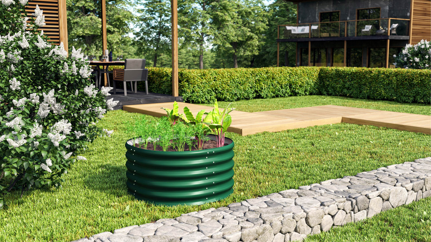 Das Vitavia Hochbeet Terra besticht darüber hinaus durch moderner Optik und eine Vielzahl an Erweiterungsmöglichkeiten und Formgebungen: Die im Bausatz angelieferten einzelnen Module sind vorgebogen, die Verbindungsstücke vorgebohrt. Größe und Gestalt können mithilfe des Hochbeets Terra BASIC, der geraden Hochbeeterweiterung Terra STRETCHED und der gebogenen Erweiterung Terra CURVE frei kombiniert werden. Das Hochbeet Terra RUND ist die kleinste Variante und kann ebenfalls gut als dekorativer Pflanzkübel genutzt werden. Durch die frei kombinierbaren Module sind den Gestaltungsmöglichkeiten kaum Grenzen gesetzt. Zwischen die beiden runden Abschlusselemente und nach jeder Erweiterung Terra CURVE können können zwei gerade Bauelemente (Erweiterung Terra STRETCHED) aneinander gesetzt werden. So kann das Hochbeet auch optimal zur Abtrennung von Zonen im Garten oder als Sichtschutz eingesetzt werden.