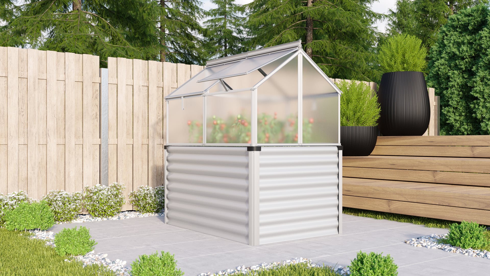 Frühbeetbausatz mit einer Eindeckung mit Hohlkammerplatten (HKP) und einem Hochbeet-Unterbau aus witterungsbeständigem Zincalume.