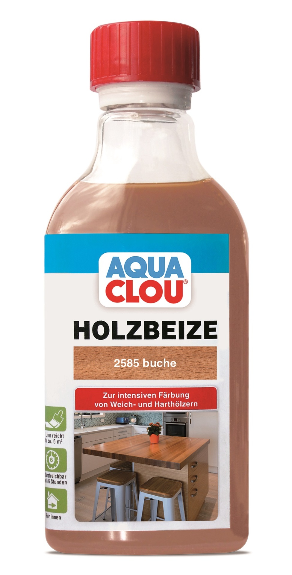 Wässrige, gebrauchsfertige und umweltschonende Pigmentbeize auf Acrylatbasis mit intensiver Porenbeizung. Durch spezielle Bindemittelzusätze werden die Pigmente sehr gut auf der Holzoberfläche fixiert, so dass sich diese Beize für das Überlackieren sowohl mit wasserverdünnbarer als auch mit lösemittelhaltigen CLOU Holzlacken eignet. Die Behandlung der gebeizten Fläche mit CLOU Holzölen ist ebenfalls möglich. Aufgrund des hohen Pigmentanteils ist AQUA CLOU Holzbeize besonders lichtecht, das Holz wird gleichmäßig eingefärbt und das Strukturbild bleibt vollständig erhalten. Für die farbige Gestaltung von rohen Holzoberflächen im gesamten Innenbereich, z. B. Möbel, Innentüren, profilierte Teile, Leisten. AQUA CLOU Holzbeize ist sowohl fürfeinporige Holzarten wie Ahorn, Birke, Buche, Erle und Kirschbaum als auch für grobporige Holzarten wie Eiche, Esche, Mahagoni und Nussbaum geeignet.
