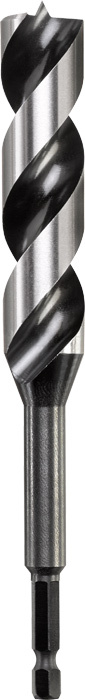 Japan Schlangenbohrer, Industriequalität, spezieller superscharfer Spitzenanschliff und Hauptschneide für absolut ausrissfreies Bohren in allen Weich- und Harthölzern. Durch diesen speziellen Spitzenanschliff werden nur kleine Holzspäne erzeugt, die schnell abtransportiert werden. Farbe schwarz, blankgeschliffen, CV-Stahl, mit Sechskantschaft 1/4“ nach ISO 1173, E 6.3, für präzise und kraftschonende Bohrungen mit Akku-Maschinen und kabelgebundenen Maschinen. Optimal für alle Bohrungen in Holzbalken und allen Holzarten. Besonders geeignet für Löcher in Sichtbereichen für Tischler, Innenausbau, Zimmerei.