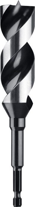 Japan Schlangenbohrer, Industriequalität, spezieller superscharfer Spitzenanschliff und Hauptschneide für absolut ausrissfreies Bohren in allen Weich- und Harthölzern. Durch diesen speziellen Spitzenanschliff werden nur kleine Holzspäne erzeugt, die schnell abtransportiert werden. Farbe schwarz, blankgeschliffen, CV-Stahl, mit Sechskantschaft 1/4“ nach ISO 1173, E 6.3, für präzise und kraftschonende Bohrungen mit Akku-Maschinen und kabelgebundenen Maschinen. Optimal für alle Bohrungen in Holzbalken und allen Holzarten. Besonders geeignet für Löcher in Sichtbereichen für Tischler, Innenausbau, Zimmerei.