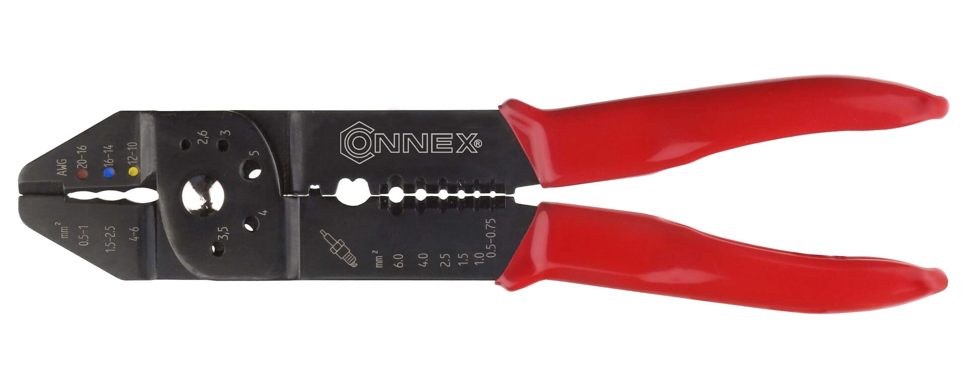 Die Kabelschuh-und Abisolierzange von CONNEX ist 210 mm lang, entspricht der EN 60 352-2 und dient dem Verarbeiten von isolierte Kabelschuhen. Die Schenkel sind Kunststoff überzogen.