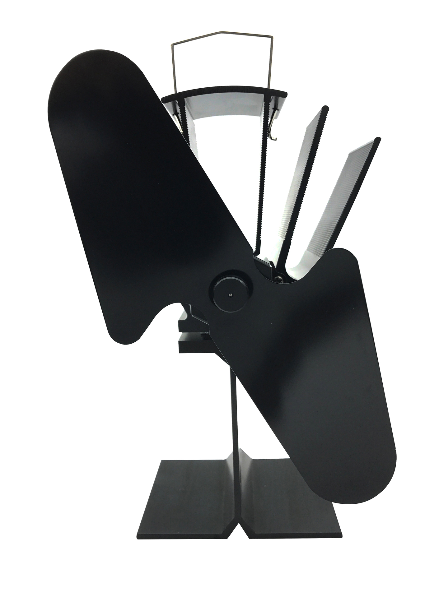 Der 2-flügelige FIREFIX Kaminofen-Ventilator wird durch die Wärmeabgabe des Ofens angetrieben.