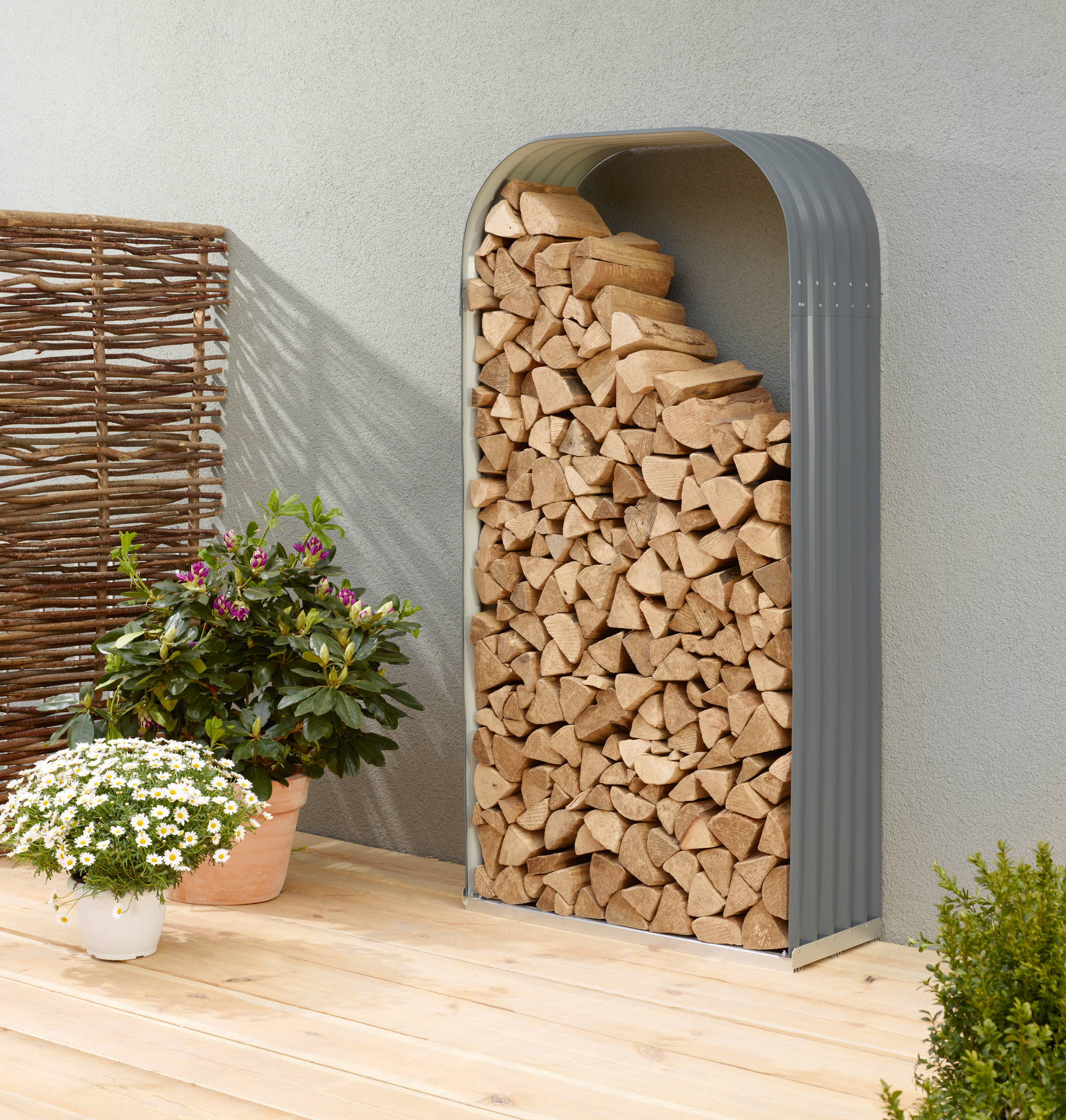 Kaminholzregal-Bausatz aus witterungsbeständigen Zincalume-Blechen inklusive einer Unterkonstruktion aus eloxierten Aluminiumprofilen.