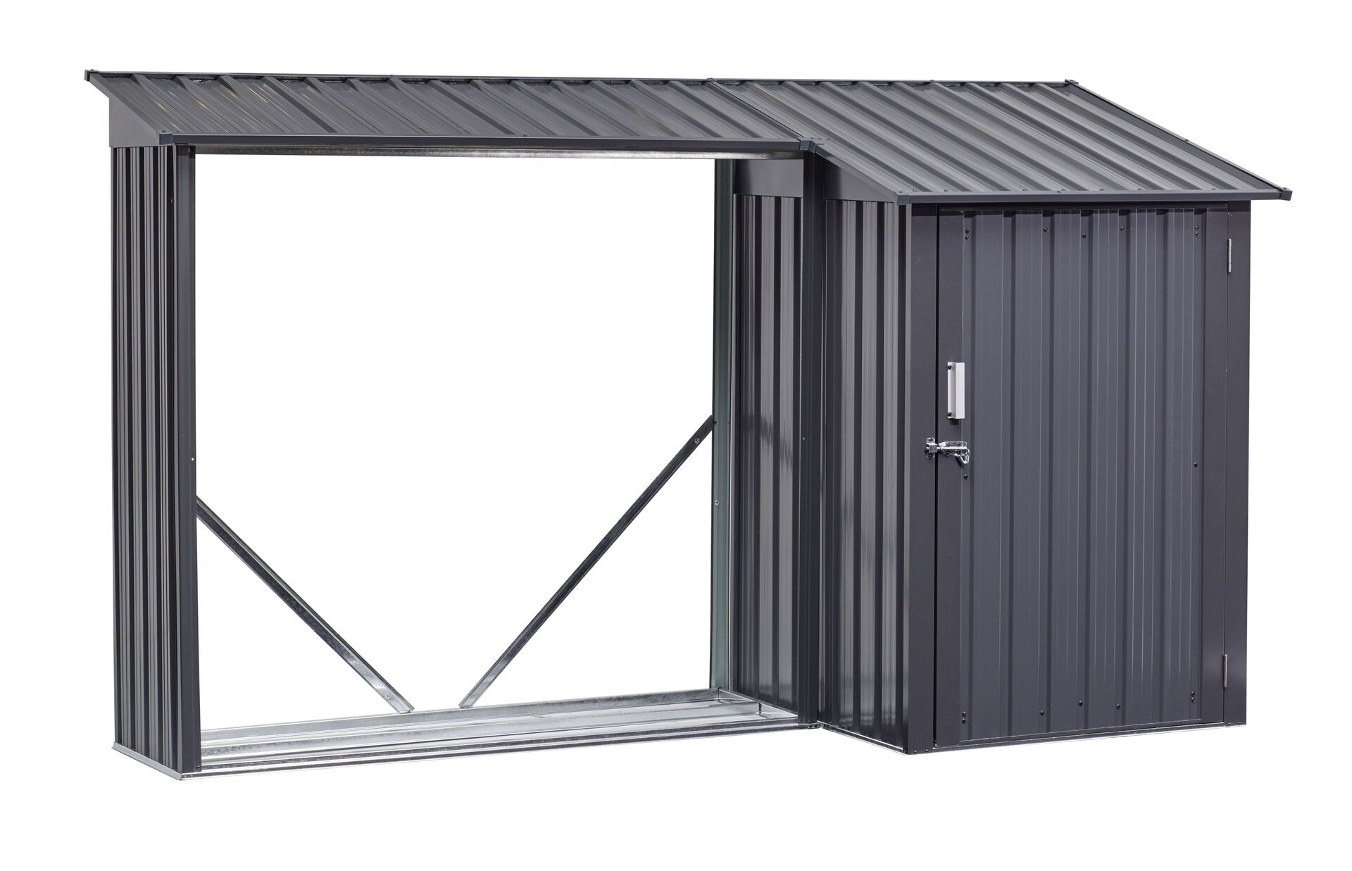 Das Kaminholzregal mit Geräteraum ist die perfekte Kombination, um Spaltholz sicher zu stapeln und Gartengeräte sauber und ordentlich aufzubewahren. Der Unterbau ist aus hochwertigen verzinkten Stahlblechprofilen. Brennholz liegt sicher auf dem Unterbau auf und ist vor ablaufendem Regenwasser geschu?tzt. Die Seitenwände und die Überdachung sind aus stabilen profilierten Stahlblechen. Der Geräteraum hat eine Flu?geltu?r, die sowohl mit einem Kunststoff-Griff wie auch einem Tu?r-Riegel ausgestattet ist. Bei Bedarf ist der Geräteraum abschließbar (ein Vorhängeschloss ist im Lieferumfang nicht enthalten).