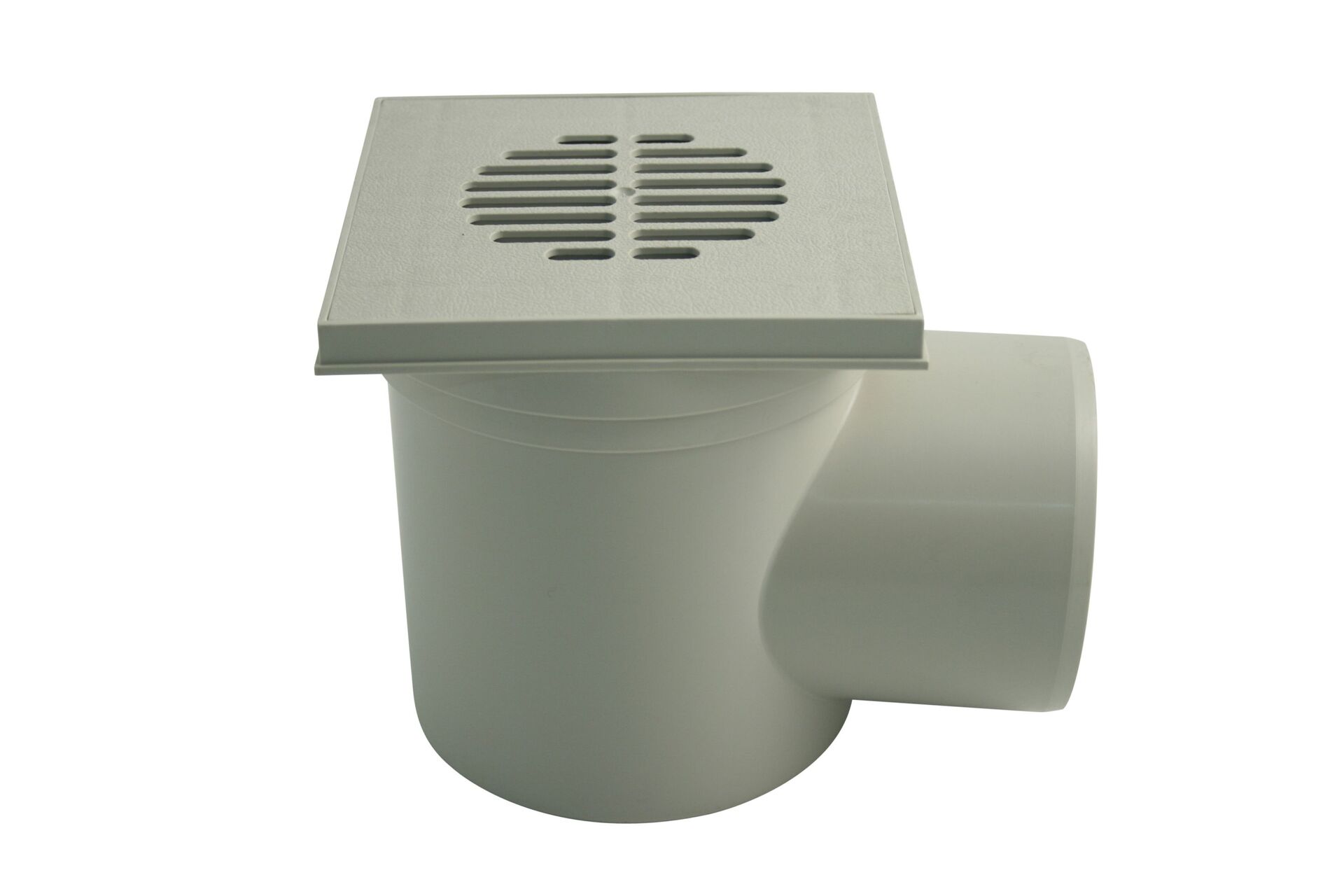 Kellerablauf, mit Kunststoffrost 150 x 150 mm, grau, schlagfest, temperaturbeständiger, säure- und laugenbeständiger Kunststoff aus PP (Polypropylen), mit drehbarem Oberteil, Geruchsverschluss und Schlammeimer. Edelstahlrost (EAN-Nr. 067834) als Sonderzubehör erhältlich.