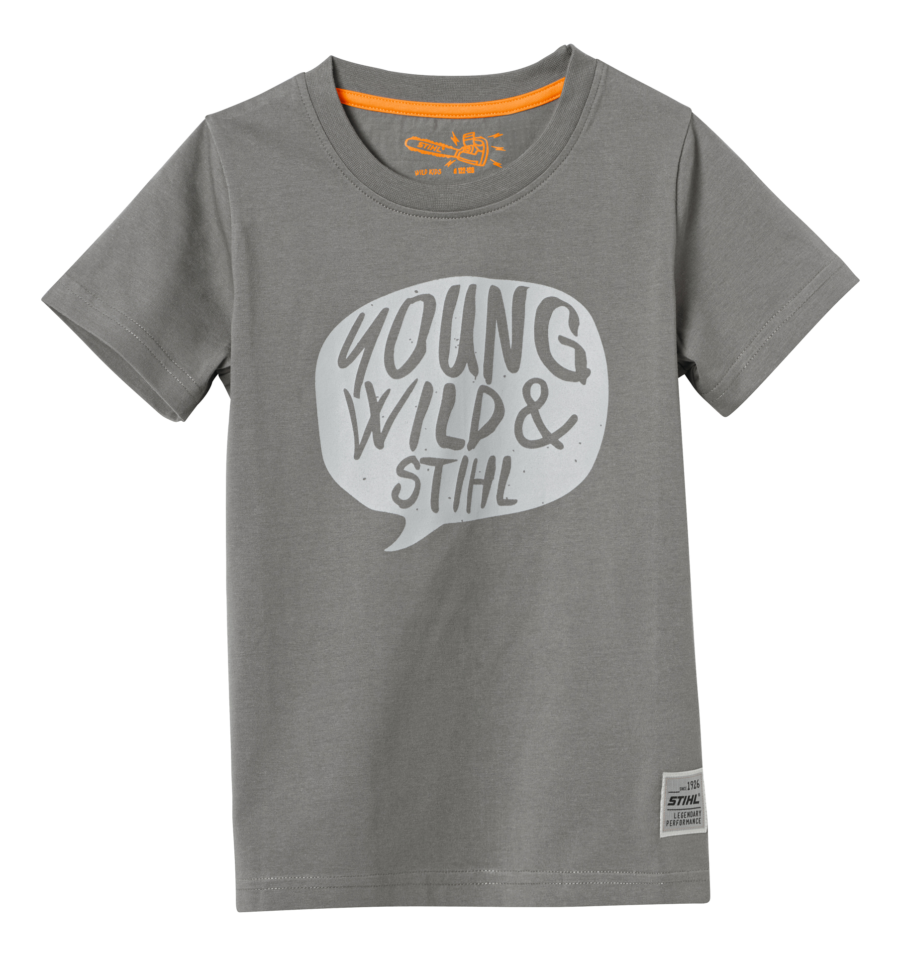 Für wilde Kids – graues Shirt mit coole YOUNG WILD & STIHL-Aufdruck auf der Vorderseite und das LEGENDARY PERFORMANCE-Label. Das neues Lieblingsteil der Kleinen aus 100 % Baumwolle ist superweich und robust für die nächsten Abenteuer.