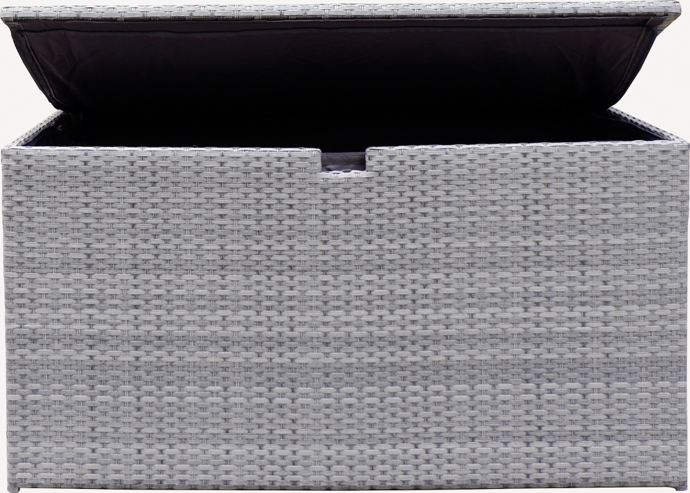 Kissenbox aus Alu-Kunststoffgeflecht mit Gasdruckfederfunktion und wasserabweisender Innentasche.