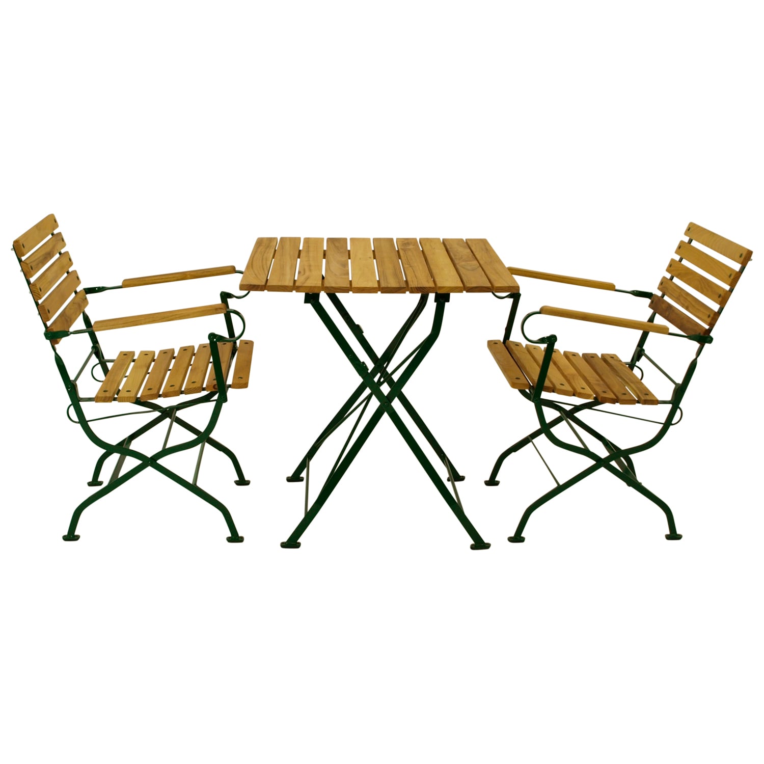 Klappgarnitur 3-teilig (2x Armlehnensessel, 1x Tisch 70x70cm), Gestell Flachstahl dunkelgrün pulverbeschichtet, Belattung Robinienholz.