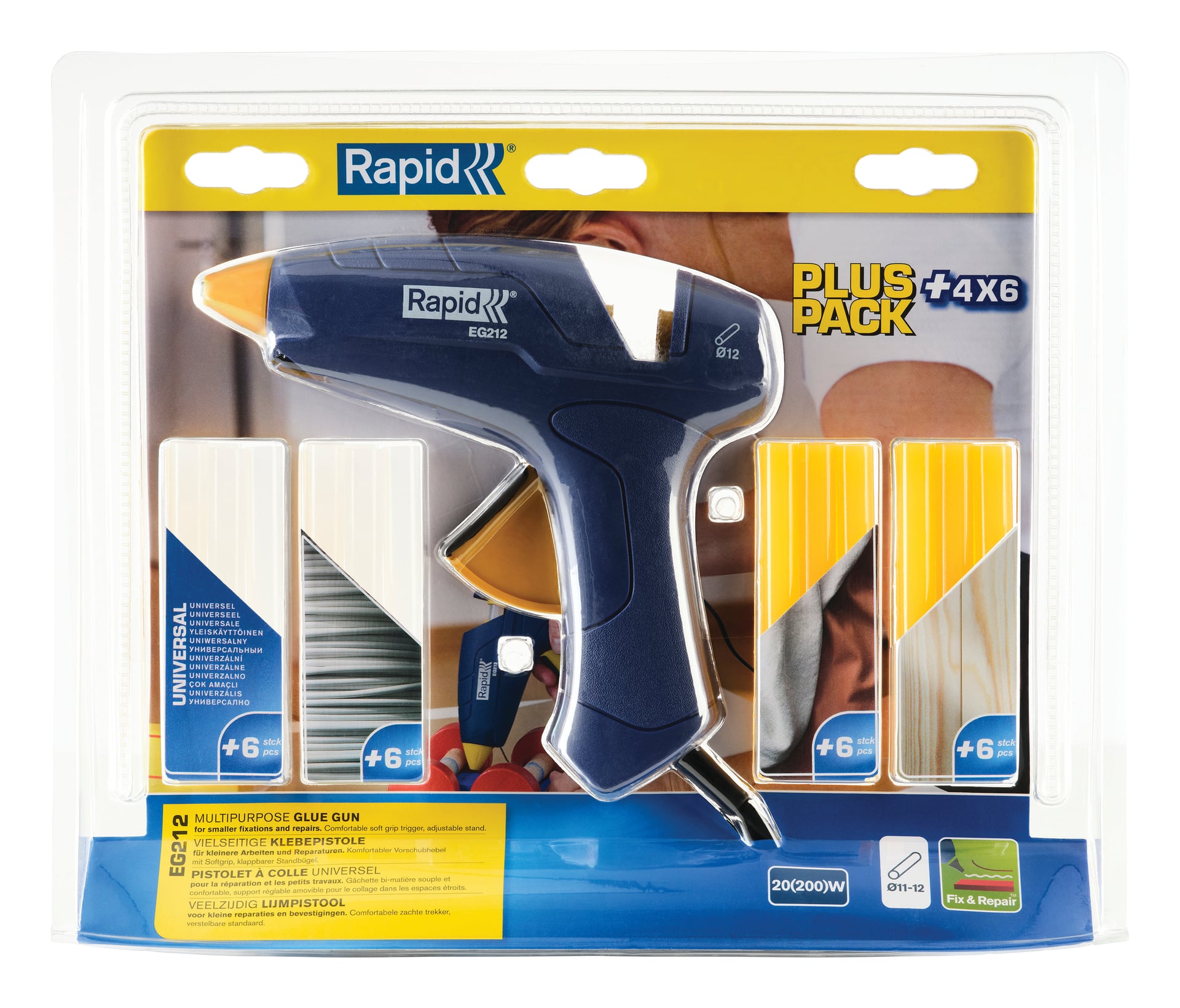 Mit insgesamt 4 Sorten hochwertigem Kleber, der für alle gängigen Anwendungen geeignet ist, sind Sie bestens ausgerüstet. Die mitgelieferten 24 Klebesticks entsprechen 350 g Kleber. Die praktische Stehblister-Verpackung macht die Lagerung und Platzierung spielend einfach.